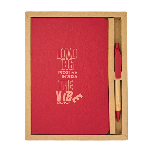 Zestaw składający się z notesu A5 w linie i długopisu.