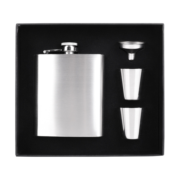 Piersiówka ze stali nierdzewnej w zestawie z dwoma kieliszkami i lejkiem.