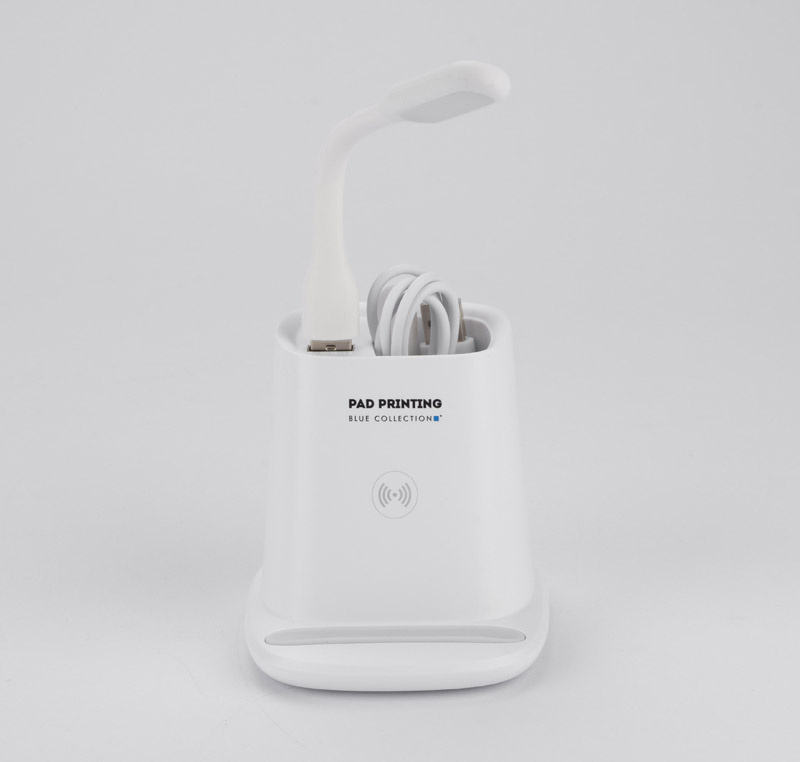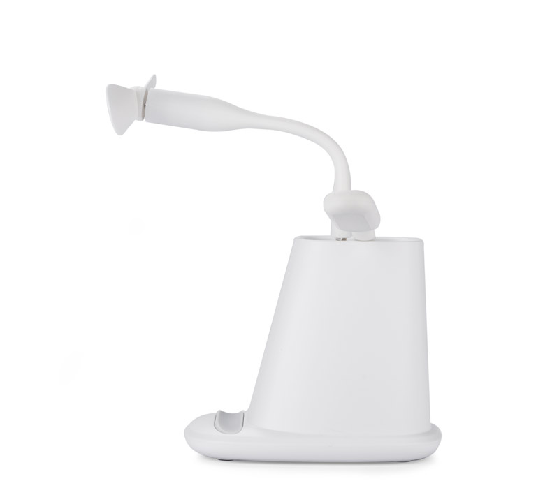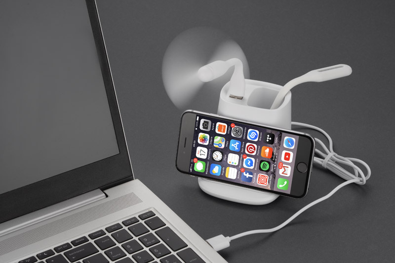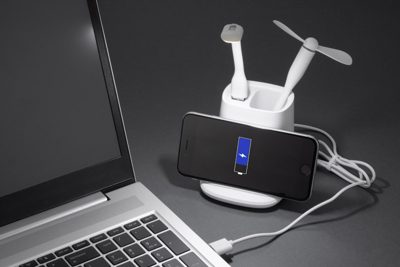 Posiada on wbudowaną ładowarkę bezprzewodową, która służy również jako stojak do telefonu, jeden port USB, który zasili dołączone do produktu akcesoria: wiatraczek lub