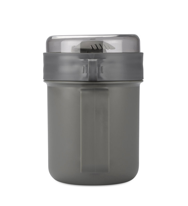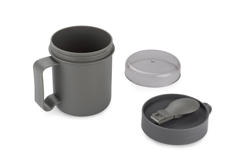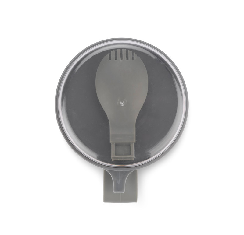 Posiada wygodny uchwyt i dołączony składany łyżko-widelec.