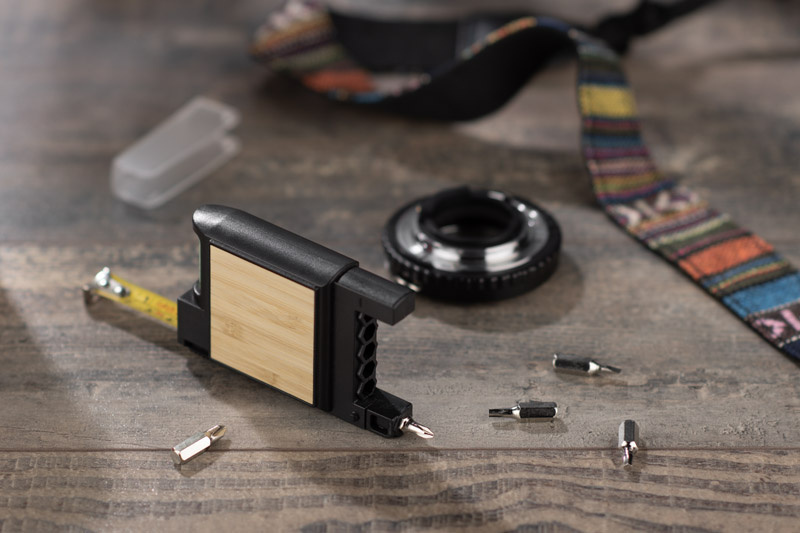 Narzędzie wielofunkcyjne ALGO wyposażone w 3-metrową miarkę, poziomicę oraz wbudowany wkrętak z wymiennymi bitami.