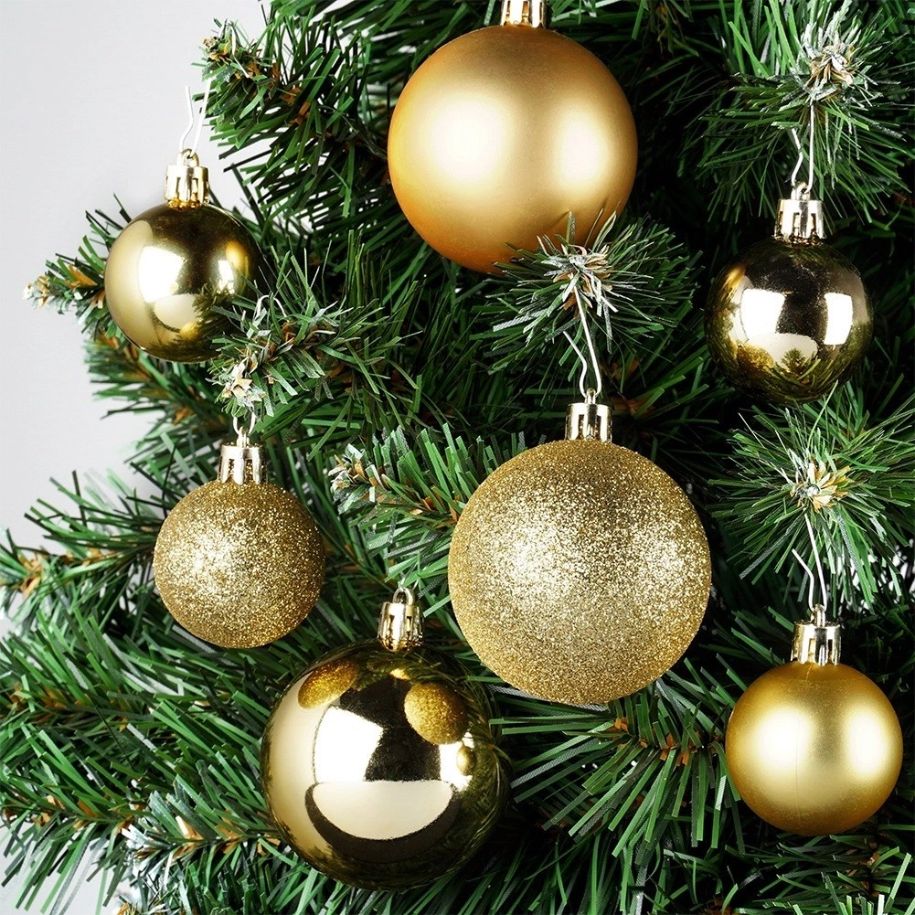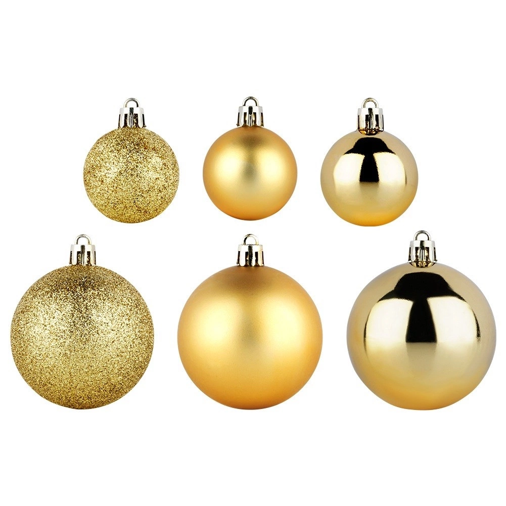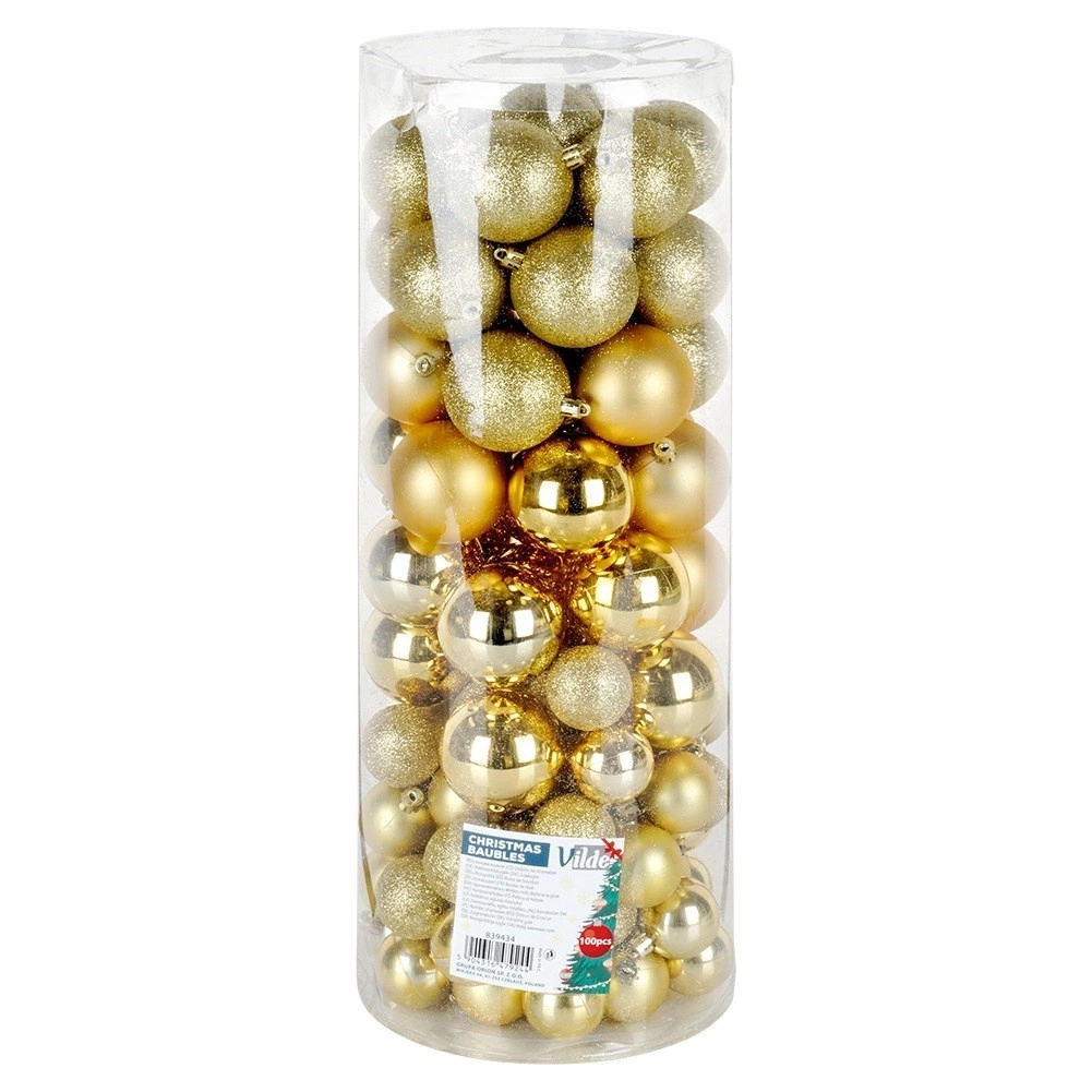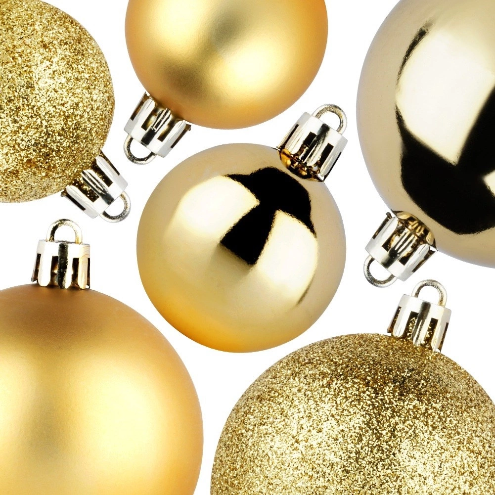 - Zestaw 100 dekoracyjnych bombek na choinkę w złotym kolorze w dwóch rozmiarach. Bombki w strukturze błyszczącej, matowej i brokatowej. Bombki są nietłukące.