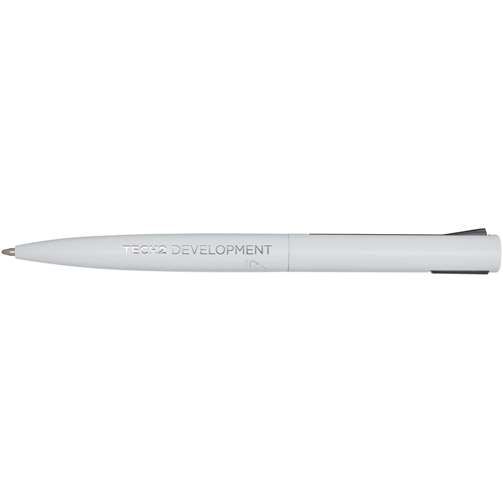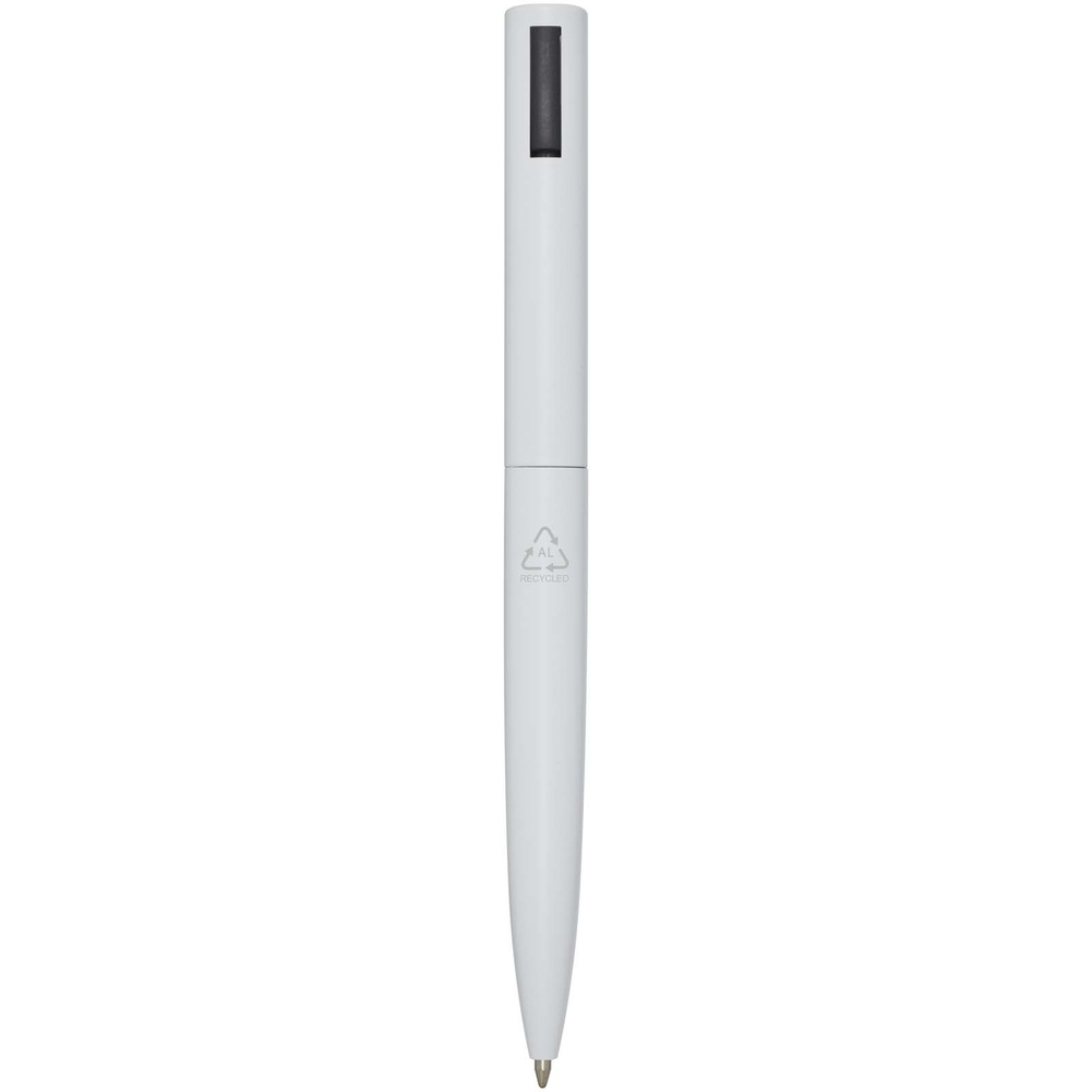 Długopis z górną częścią korpusu wykonaną z tworzyw sztucznych pochodzących z recyklingu i dolną częścią korpusu wykonaną z aluminium pochodzącego z recyklingu.