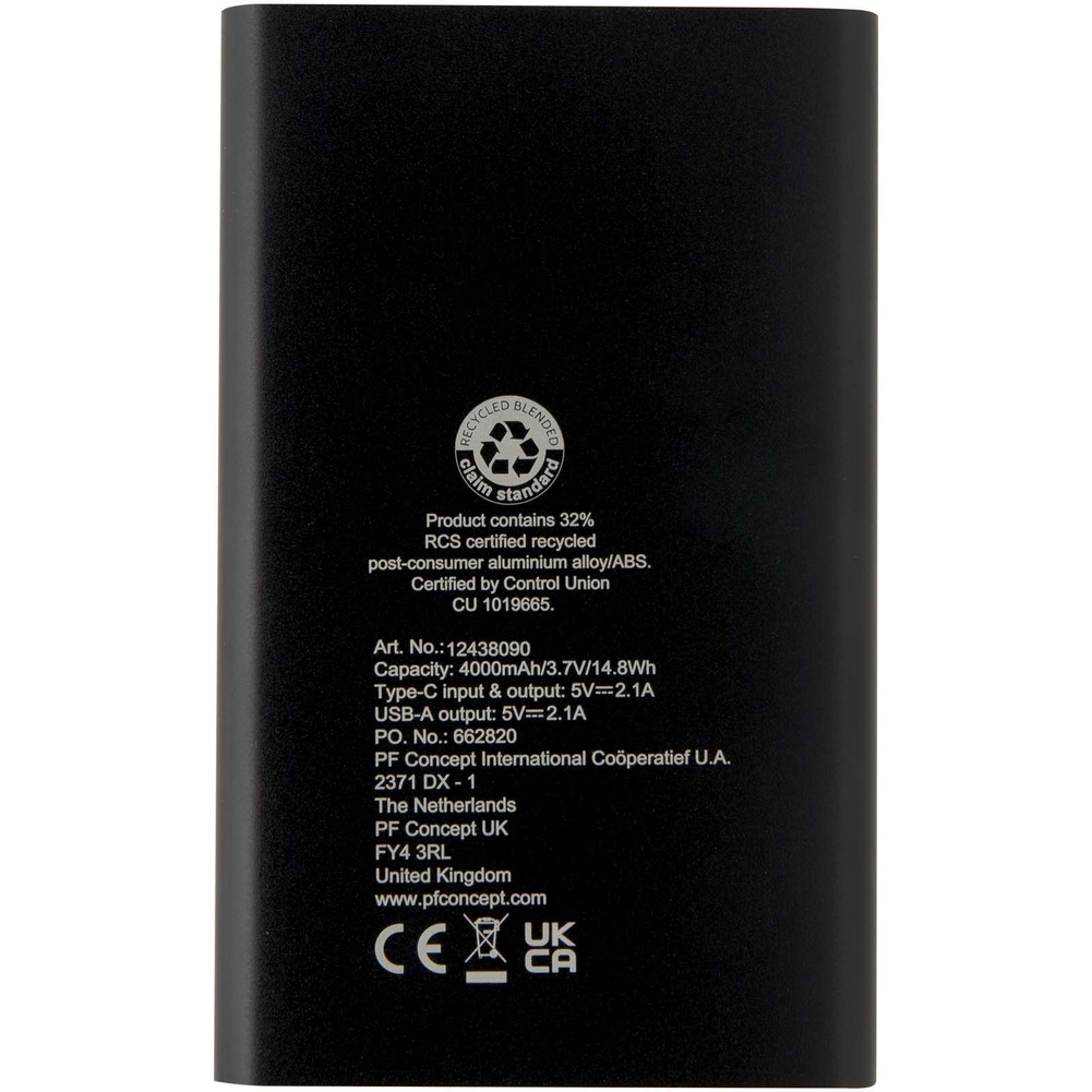Powerbank jest wykonany w 25% z aluminium pochodzącego z recyklingu z certyfikatem RCS i jest wyposażony w akumulator litowo-polimerowy o pojemności 4000 mAh,