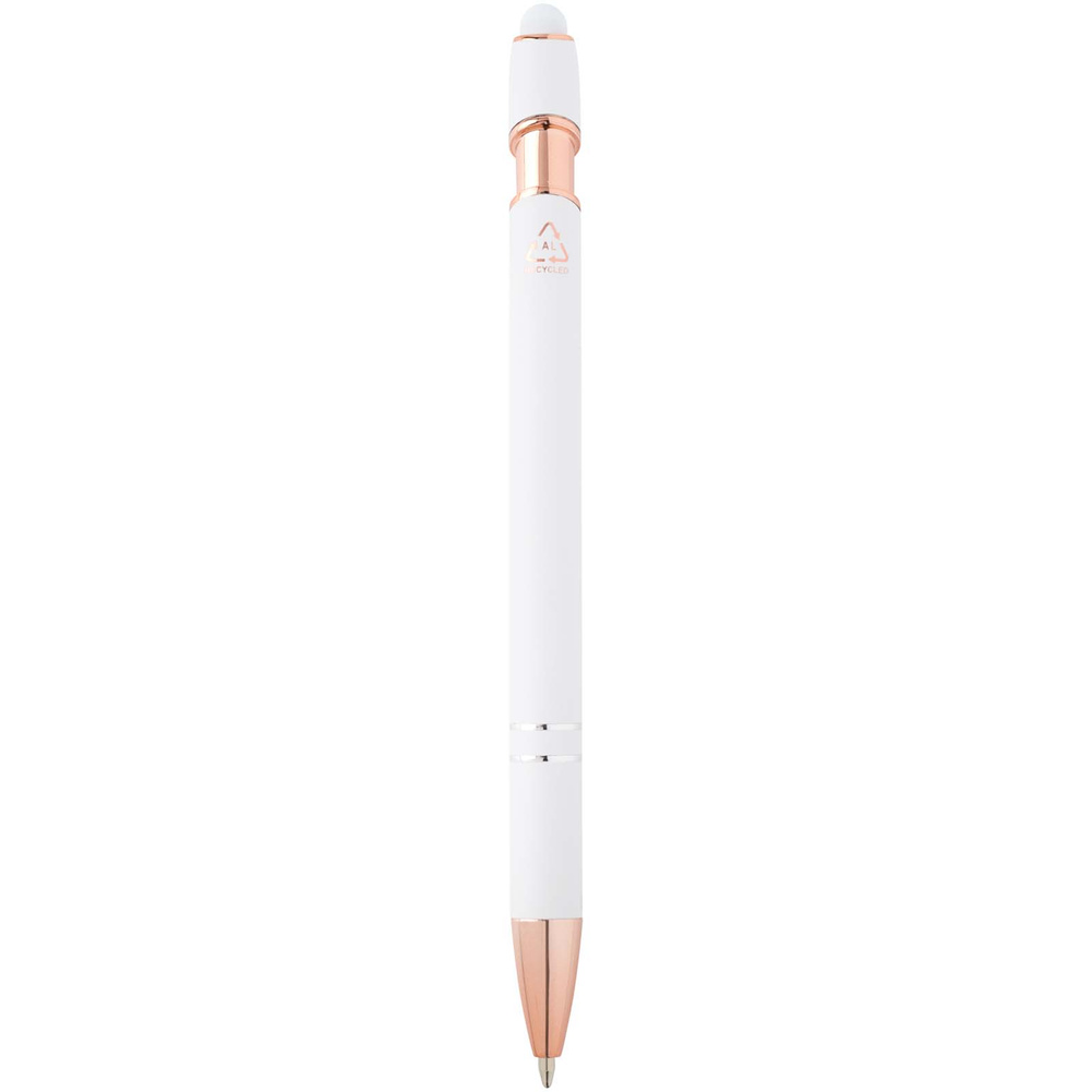 Długopis Nanna z wykończeniem w kolorze różowego złota ma korpus wykonany z aluminium z recyklingu i rysik dotykowy wykonany z silikonu.