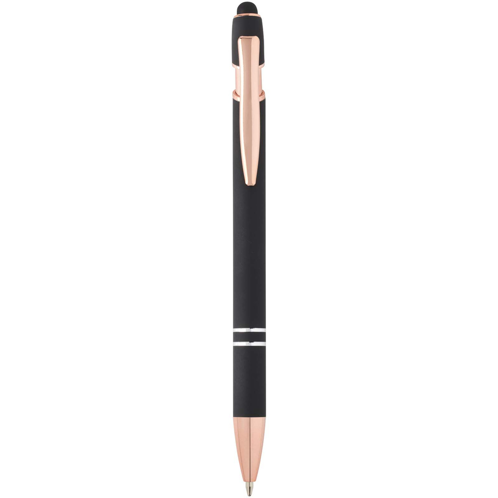 Długopis Nanna z wykończeniem w kolorze różowego złota ma korpus wykonany z aluminium z recyklingu i rysik dotykowy wykonany z silikonu.