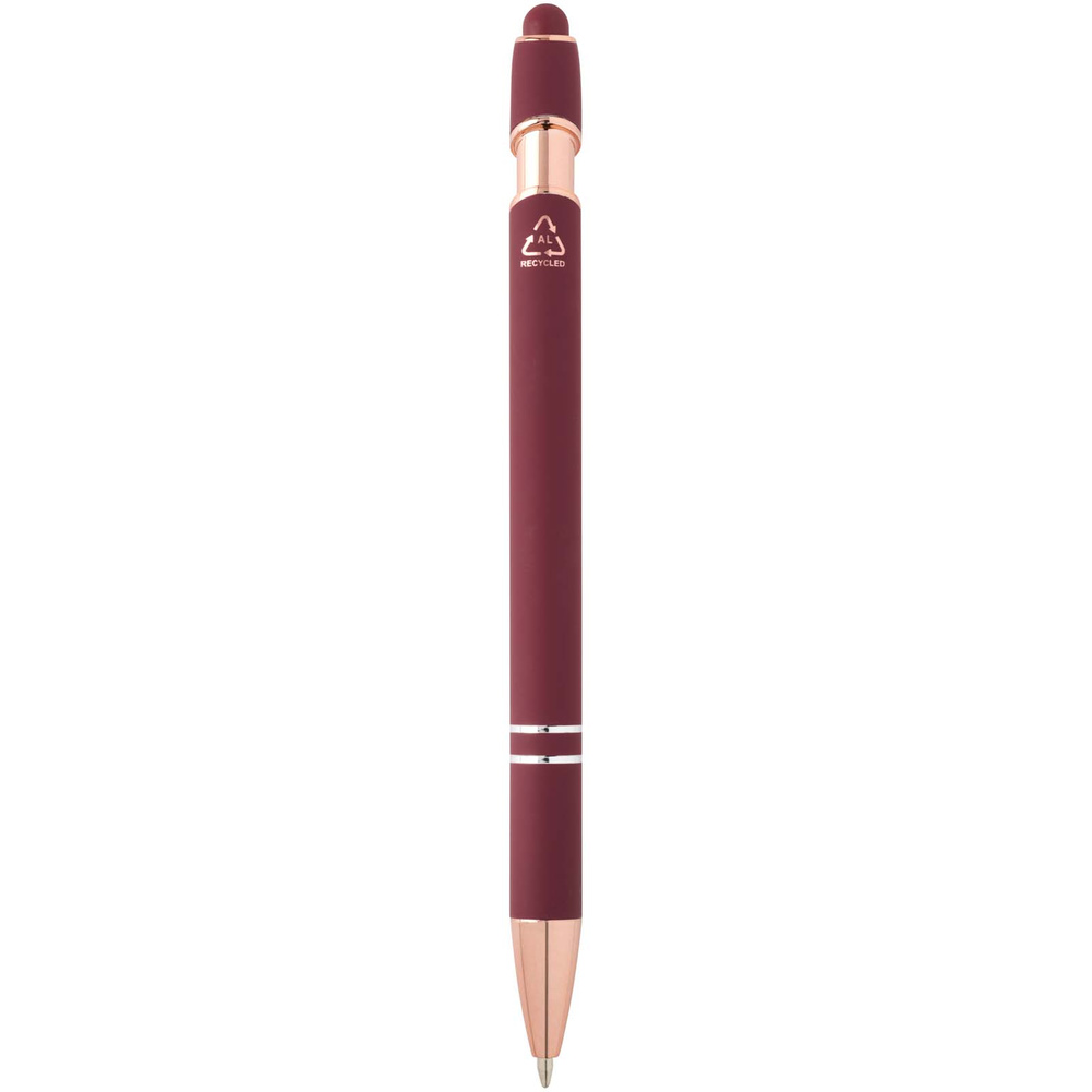Długopis Nanna z wykończeniem w kolorze różowego złota ma korpus wykonany z aluminium z recyklingu i rysik dotykowy wykonany z silikonu.