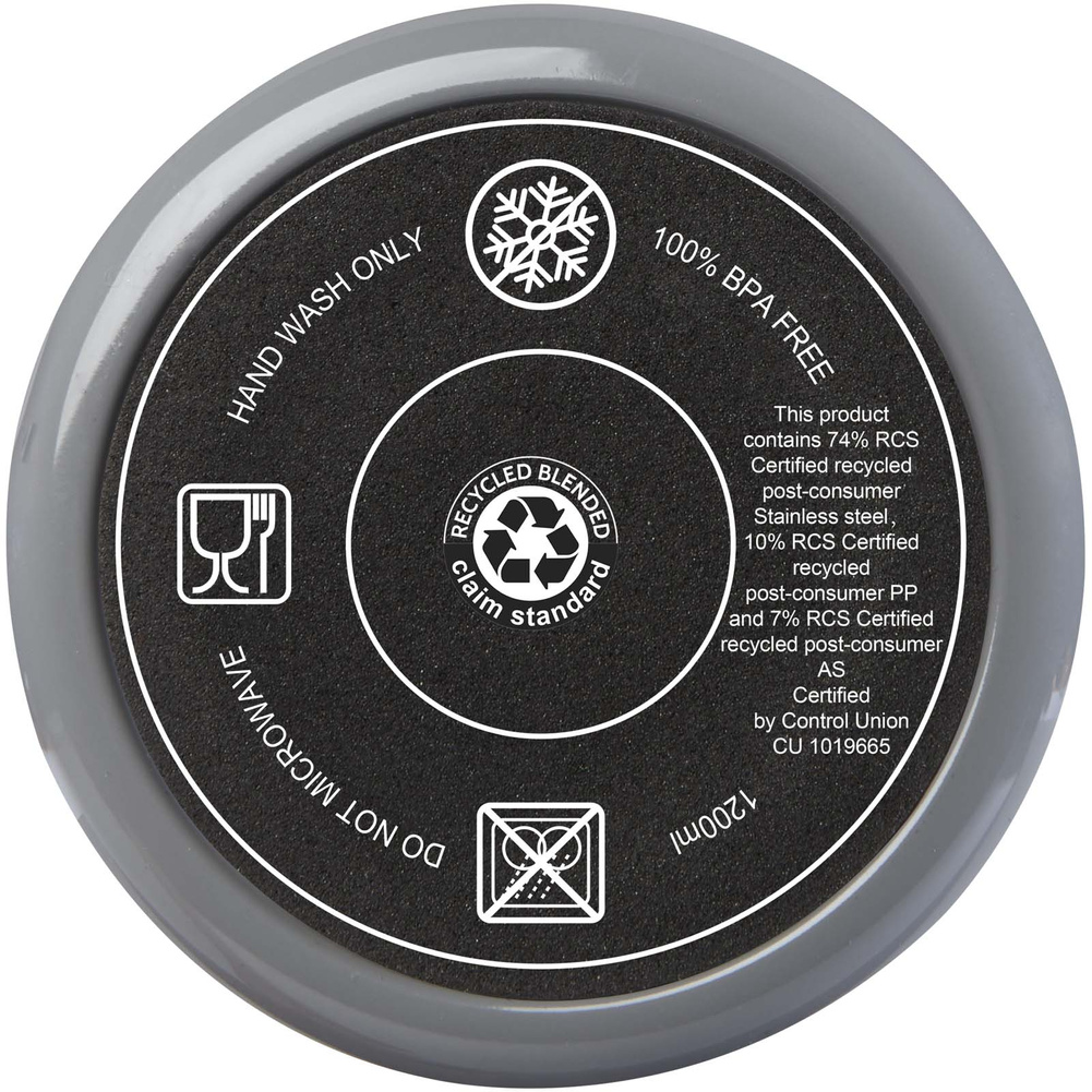 Wewnętrzna ścianka kubka wykonana jest z tworzyw sztucznych pochodzących z recyklingu, a zewnętrzna ze stali nierdzewnej z certyfikatem RCS.