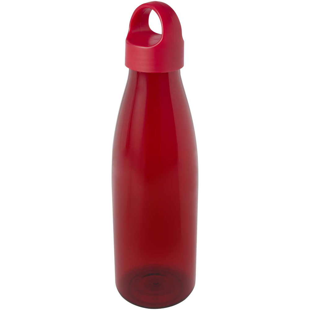 Butelka na wodę wykonana z tworzywa RPET z certyfikatem RCS, wyposażona w wygodny uchwyt do przenoszenia zintegrowany z zakrętką.