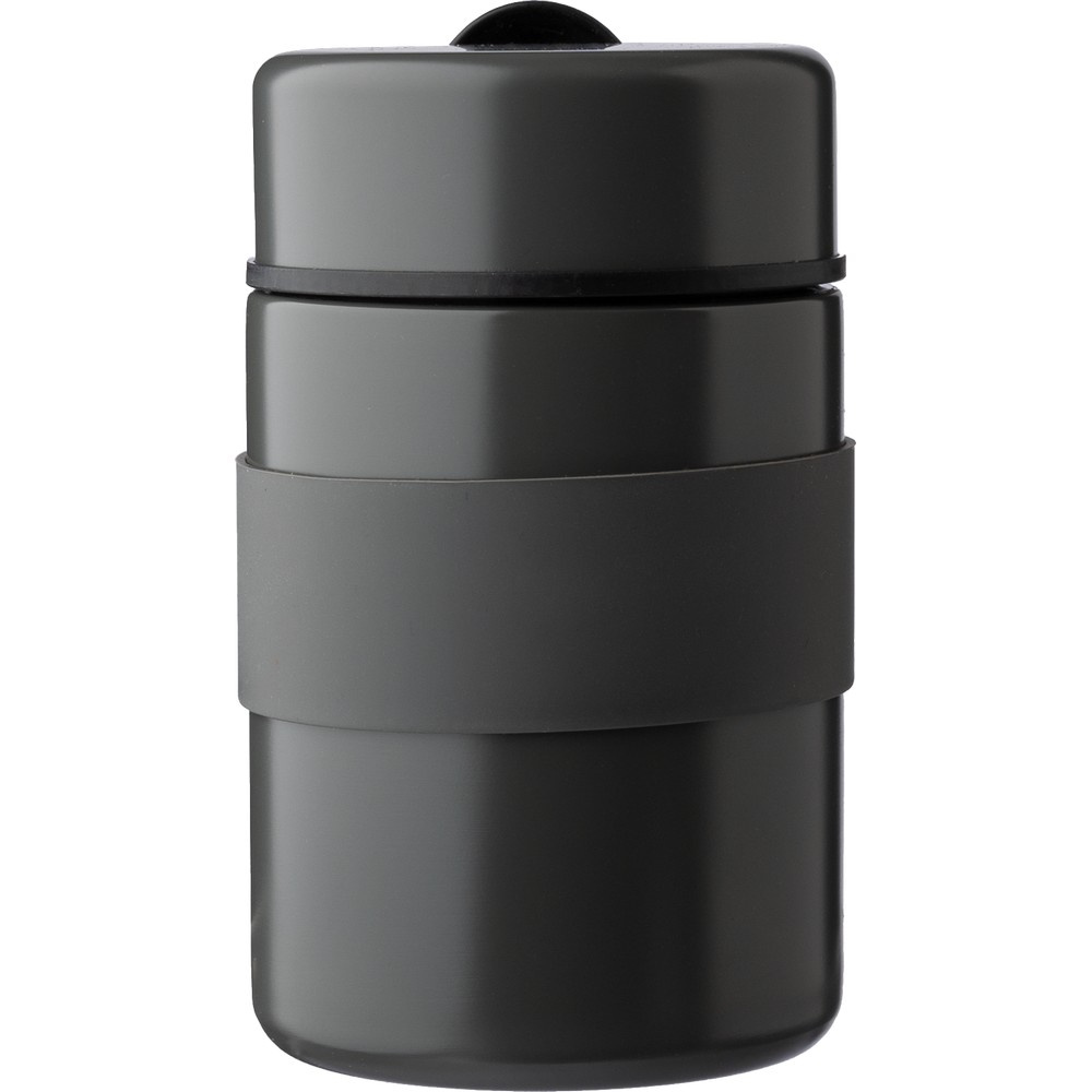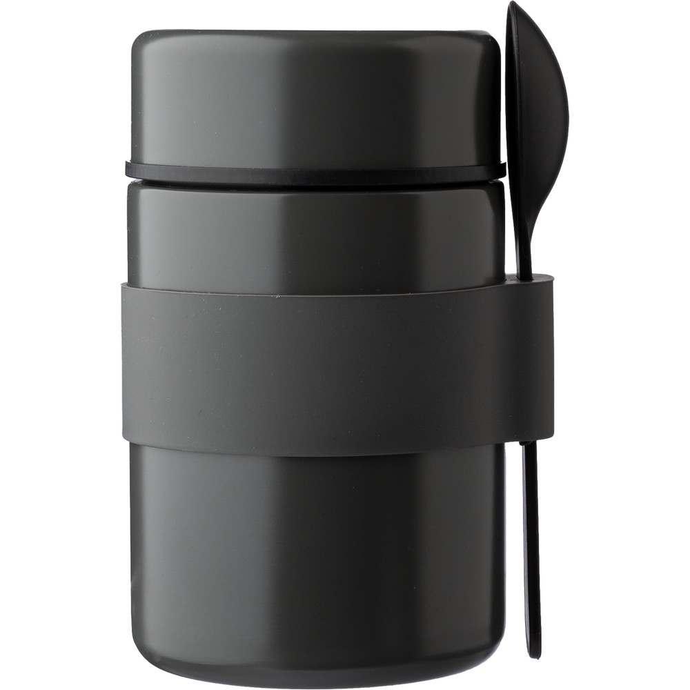 Pojemnik na żywność 460 ml z łyżeczką, silikonowy uchwyt w kolorze pojemnika, posiada podwójne ścianki ze stali nierdzewnej z próżnią między ściankami, co spowalnia