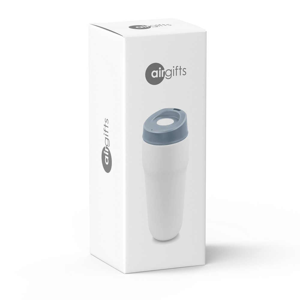 Kubek termiczny 400 ml Air Gifts, posiada podwójne ścianki ze stali nierdzewnej i ceramiki z próżnią między ściankami, co spowalnia oddawanie temperatury na zewnątrz,