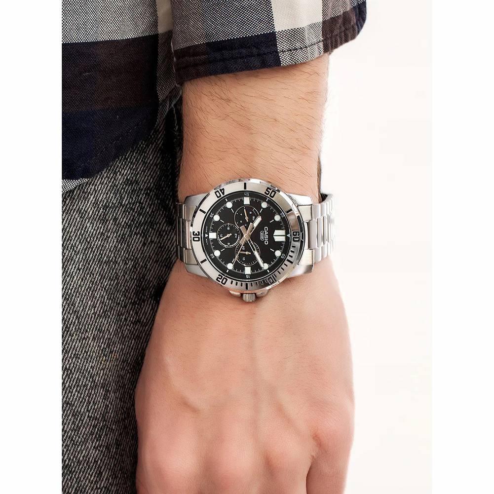 Zegarek męski CASIO MTP-VD300D-1E to doskonałe połączenie nowoczesnego designu i praktycznej funkcjonalności, które przypadnie do gustu każdemu miłośnikowi nowoczesnej elegancji. Jego okrągła, stalowa koperta w srebrnym kolorze nadaje mu wyjątkowego charakteru, a jednocześnie sprawia, że zegarek staje się uniwersalnym dodatkiem pasującym zarówno do codziennych stylizacji, jak i bardziej formalnych okazji. Tarcza zegarka, utrzymana w stonowanej, czarnej kolorystyce, została ozdobiona srebrnymi indeksami oraz smukłymi wskazówkami, które zapewniają doskonałą czytelność czasu. Chronografy umieszczone na tarczy dodają całości nuty dynamizmu i nowoczesności.