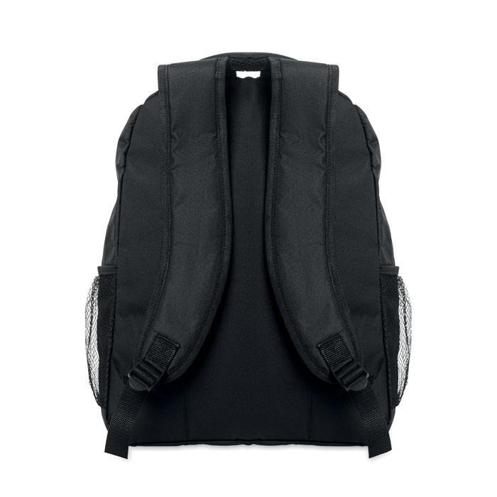 Plecak na laptopa 15 cali z poliestru 600D RPET z wyściełaną przegrodą na laptopa wewnątrz, kieszeniami z siatki po obu stronach i przednią kieszenią zapinaną na zamek.