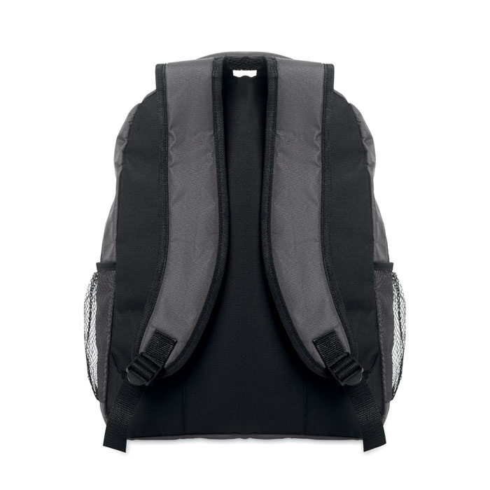 Plecak na laptopa 15 cali z poliestru 600D RPET z wyściełaną przegrodą na laptopa wewnątrz, kieszeniami z siatki po obu stronach i przednią kieszenią zapinaną na zamek.