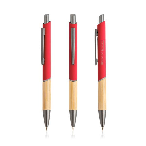 Ten długopis piszący na niebiesko ma nowoczesny design, łączący recyklingowany metal z gumową powłoką i naturalnym bambusem.