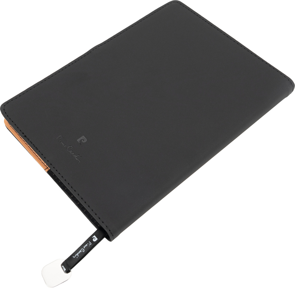 Luksusowy notatnik Pierre Cardin, o formacie A5, w twardej okładce z czarnymi przeszyciami.