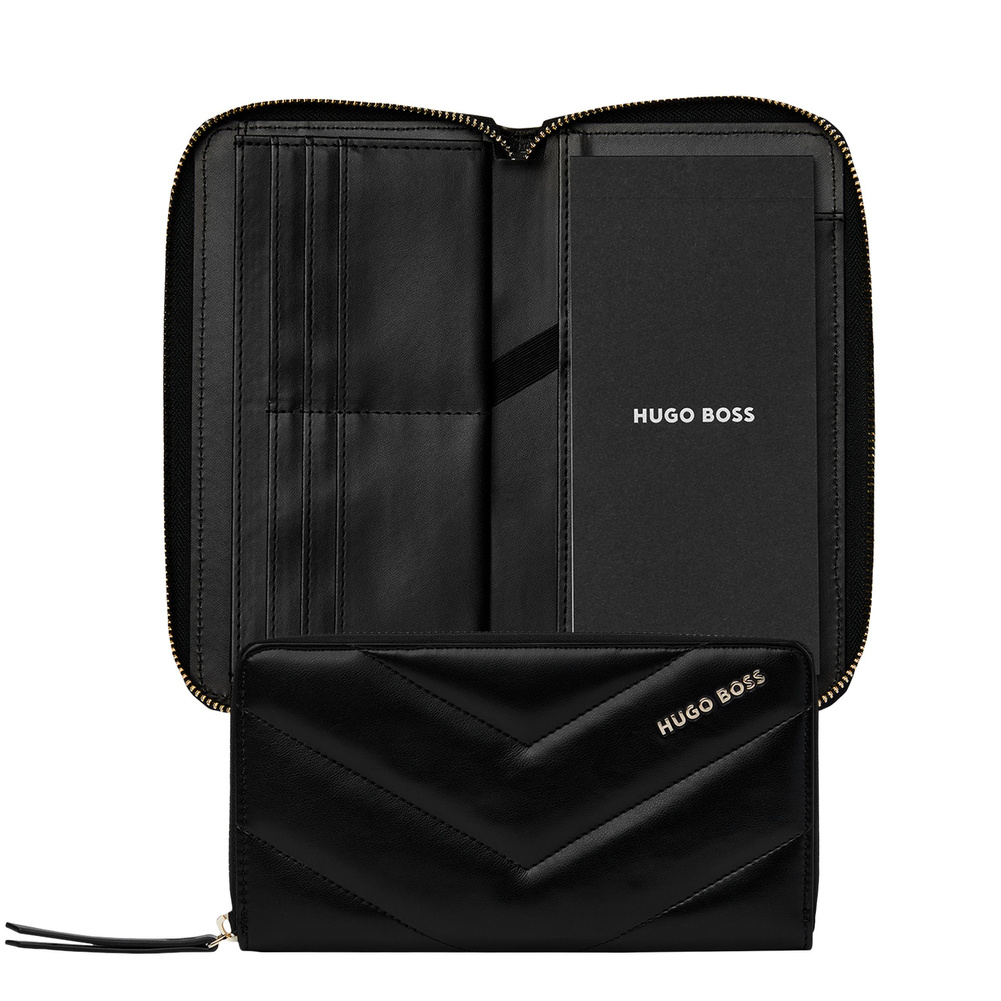 Kobiece i eleganckie teczki Triga są wzbogacone o luksusowe złote akcenty i matową fakturę skóry wegańskiej. Podpisane są piękną złotą płytką z logo HUGO BOSS, a ich powierzchnia jest pikowana geometrycznym i graficznym wzorem, czyniąc je jednocześnie nowoczesnymi i kobiecymi. Ta podłużna teczka będzie idealnym towarzyszem na co dzień, pozwalając na robienie notatek na jej papierowej podkładce, ale także posiadając kremowe wnętrze, które pozwoli na uporządkowanie wszystkich dokumentów i codziennych drobiazgów. Linia `Triga` jest idealna do łączenia i dopasowywania w kombinacje, które odpowiadają Twojemu gustowi, aby stworzyć skromne, ale wyrafinowane zestawy prezentowe.