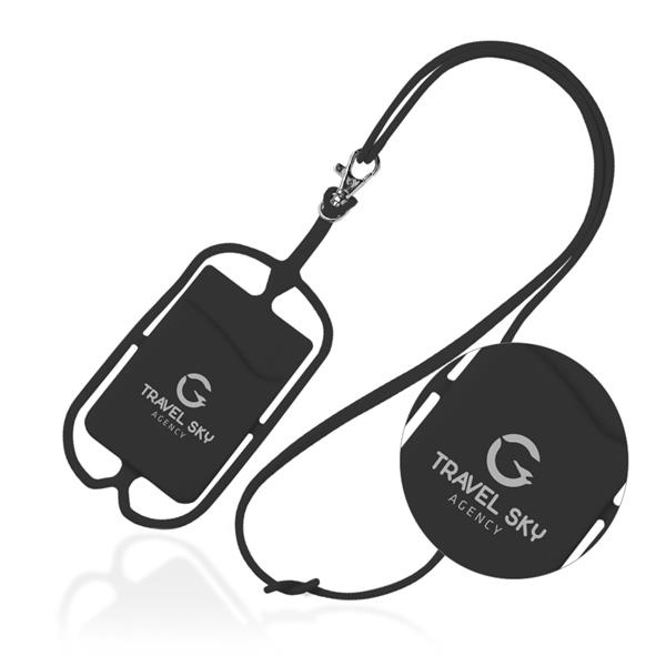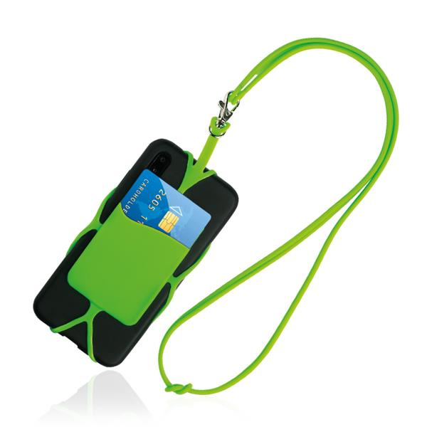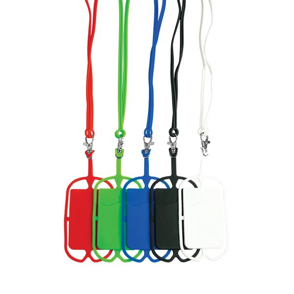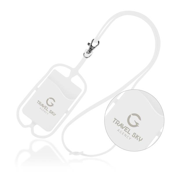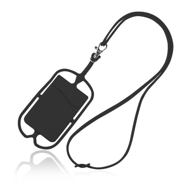 UWAGA: MOŻLIWY TYLKO 1 KOLOR ZNAKOWANIA: BIAŁY, CZARNY LUB SREBRNYSilikonowa smycz z uchwytem na telefon komórkowy oraz etui na karty płatnicze. Posiada praktyczny metalowy karabinczyk.