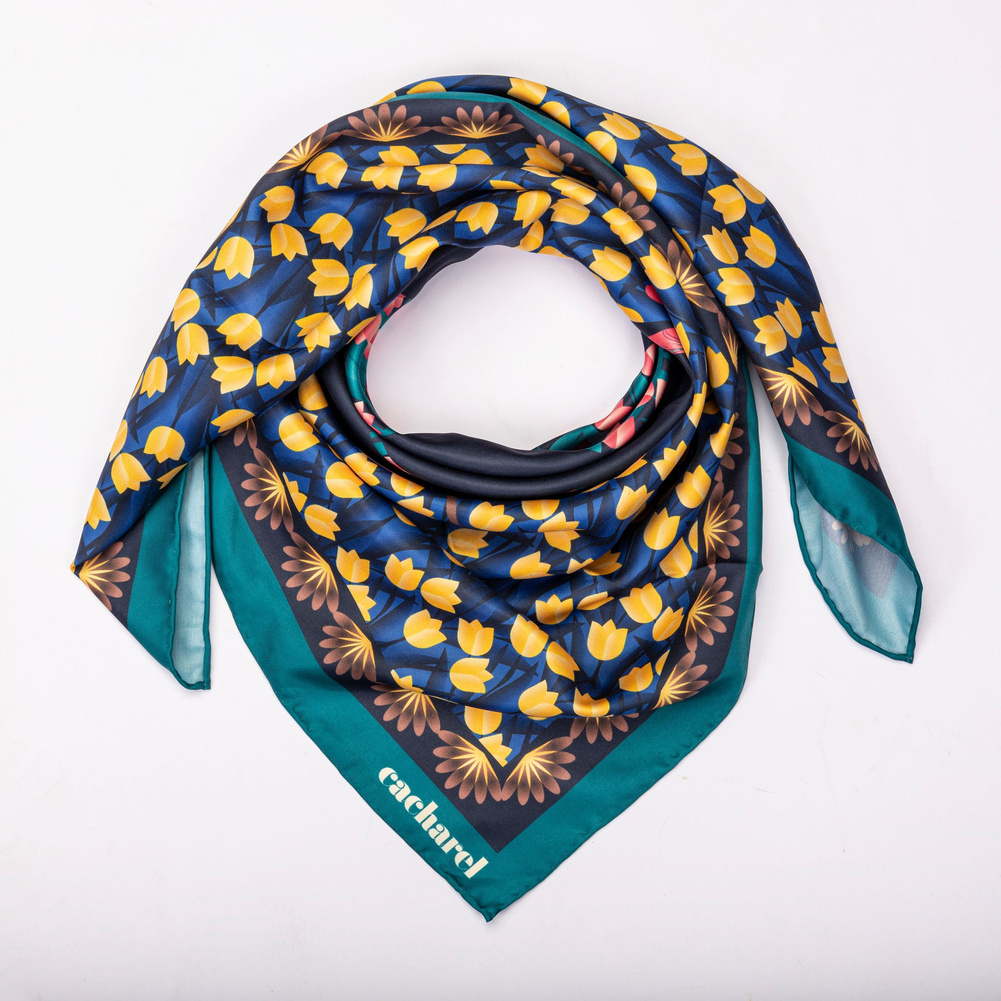 Apaszka Albane wykonana z wysokiej jakości poliestru w delikatny, jednak chrakterystyczny, kwiatowy wzór z pięknie wyeksponowanym logo Cacharel w centralnej części.