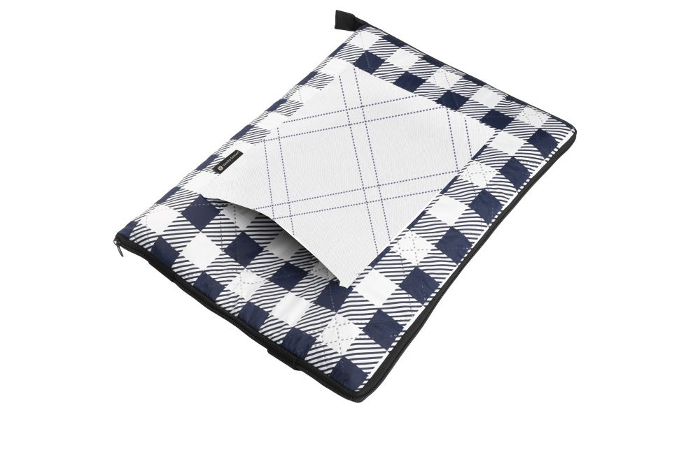 Koc ma niebiesko-biały pikowany wzór, w złożonym stanie zamykany na zamek błyskawiczny, posiada regulowany uchwyt do noszenia oraz białą kieszonkę o wymiarach 24 × 32 cm.