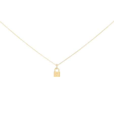 Naszyjnik posiada efektowną zawieszkę z zamkiem, której ogniwo wysadzane jest subtelnymi, ale świecącymi kryształami.