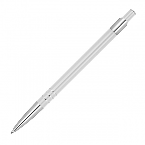 Smukły długopis, wykonany z aluminium pochodzącego z recyklingu, z niebieskim wkładem.