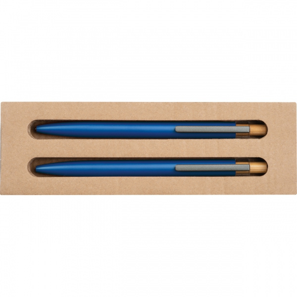 Przybory piśmienne wykonane z aluminium pochodzącego z recyklingu, zapakowane w przyjazne środowisku pudełko.