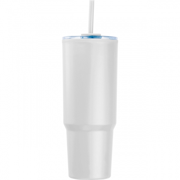 Kubek XXL, o pojemności 1200 ml, z podwójnymi ściankami, uchwytem do przenoszenia i słomką do picia.