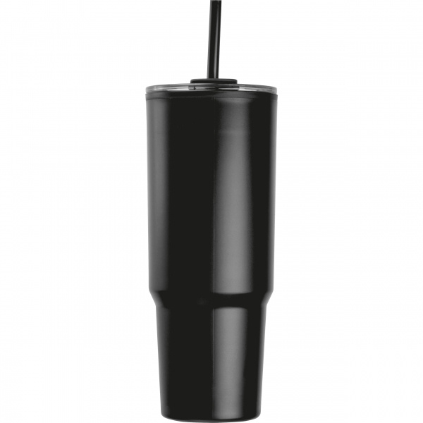 Kubek XXL, o pojemności 1200 ml, z podwójnymi ściankami, uchwytem do przenoszenia i słomką do picia.