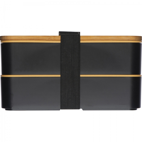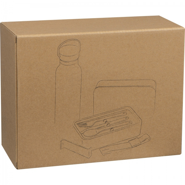 Zestaw zawierający termos próżniowy i dwupoziomowe pudełko na lunch ze sztućcami i z ruchomą przegródką pozwalającą dowolnie dzielić pudełko na 2 komory.