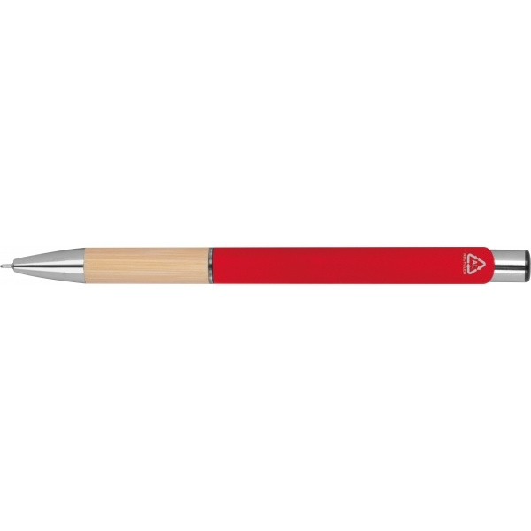 Piszący na niebiesko, pół żelowy długopis wykonany z aluminium pochodzącego z recyklingu ze srebrnymi elementami i bambusową strefą uchwytu.