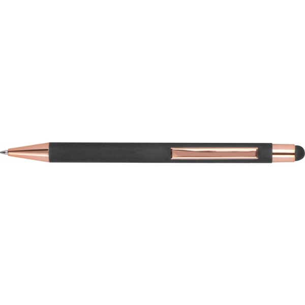 Metalowy długopis z powierzchnią soft touch, różowo złotymi elementami, niebieskim wkładem i końcówką touch pen.