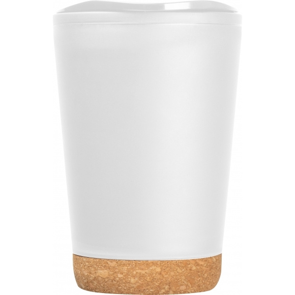 Plastikowy kubek z korkowym dnem i silikonowym wieczkiem.