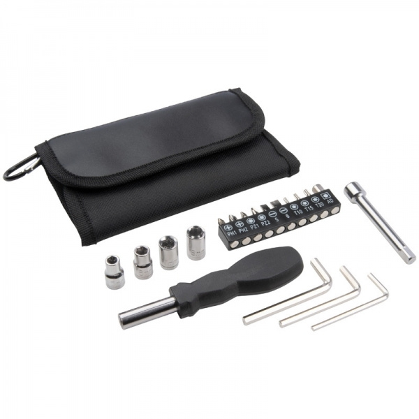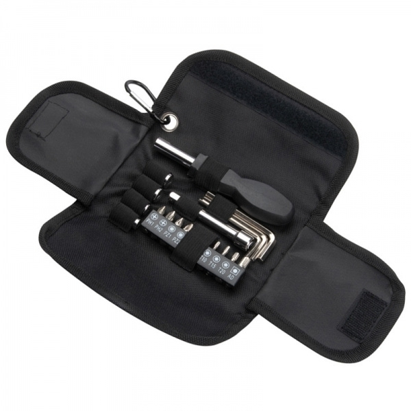 Wielofunkcyjny zestaw narzędzi wykonanych ze stali nierdzewnej.