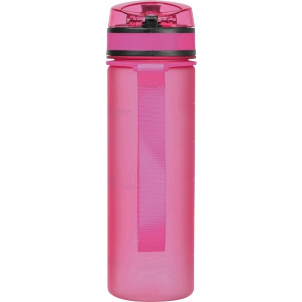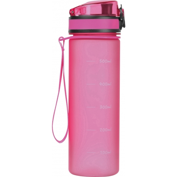 Butelka posiada wygodne otwieranie na przycisk, pętelkę do noszenia i nadrukowaną miarkę w ml.