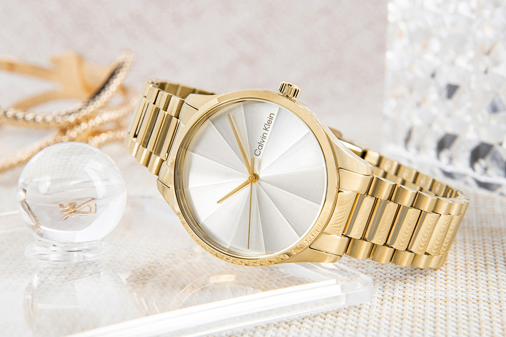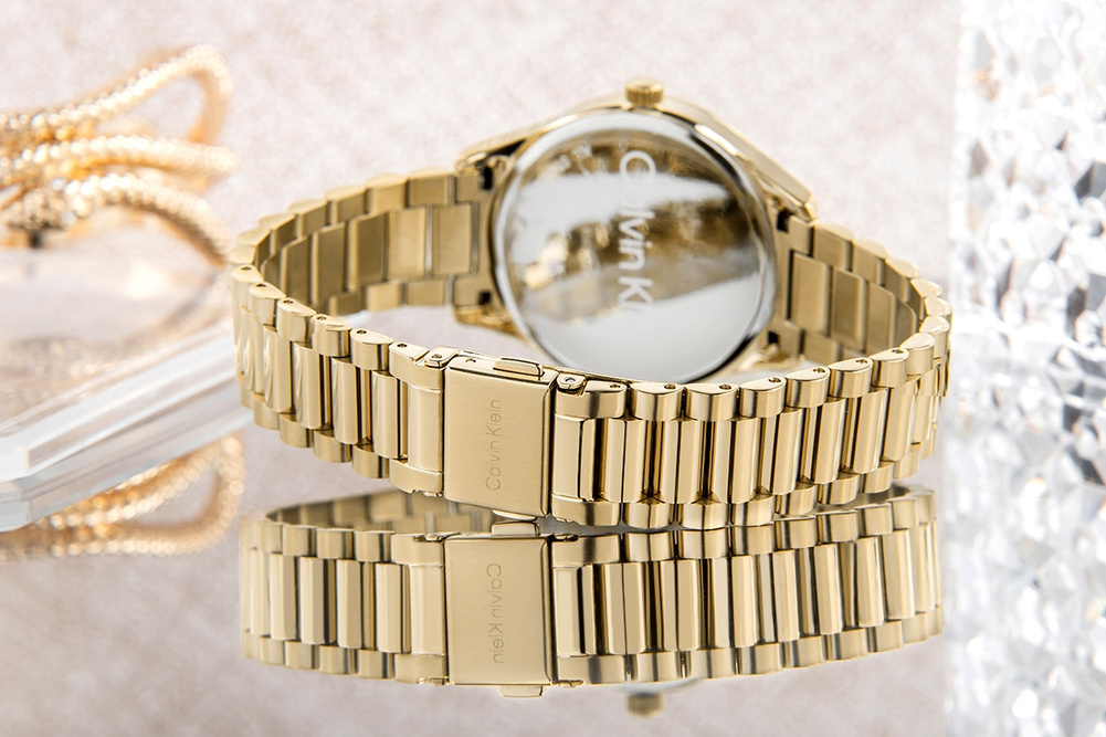 Delikatne wskazówki i tarcza, która miękko odbija światło – wszystko razem tworzy kompozycję, od której trudno oderwać wzrok. Wysokiej jakości materiały, dopracowane z zegarmistrzowską precyzją detale i perfekcyjnie skomponowana kolorystyka – zegarek Calvin Klein nosi się jak biżuterię, a każdy rzut oka na nadgarstek staje się estetycznym przeżyciem. Całość dopełniają: logo na tarczy, zapięciu bransolety oraz CK na koronce zegarka.