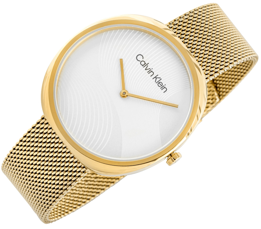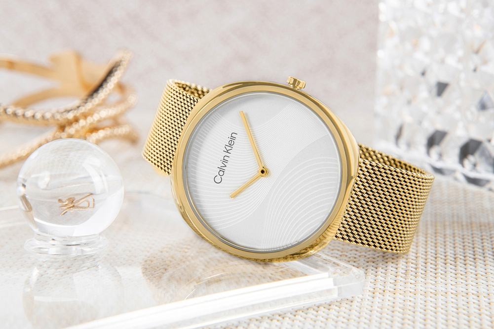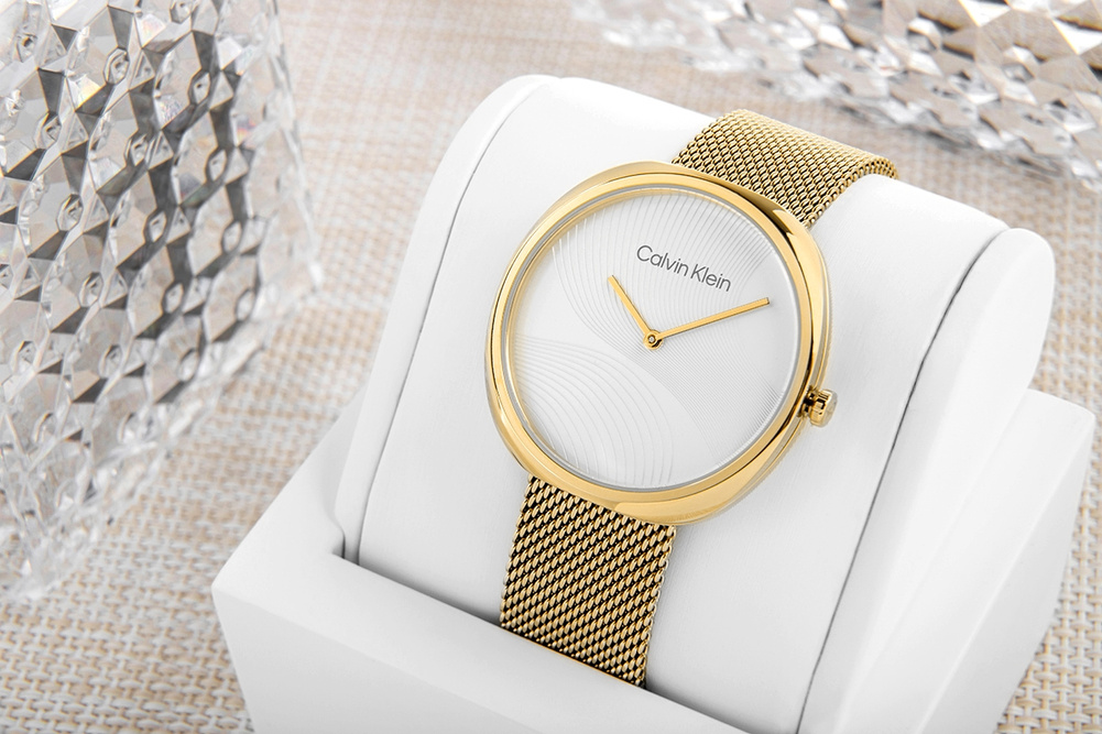 Delikatne wskazówki i tarcza, która miękko odbija światło – wszystko razem tworzy kompozycję, od której trudno oderwać wzrok. Wysokiej jakości materiały, dopracowane z zegarmistrzowską precyzją detale i perfekcyjnie skomponowana kolorystyka – zegarek Calvin Klein nosi się jak biżuterię, a każdy rzut oka na nadgarstek staje się estetycznym przeżyciem. Całość dopełniają: logo na tarczy, zapięciu bransolety oraz CK na koronce zegarka.