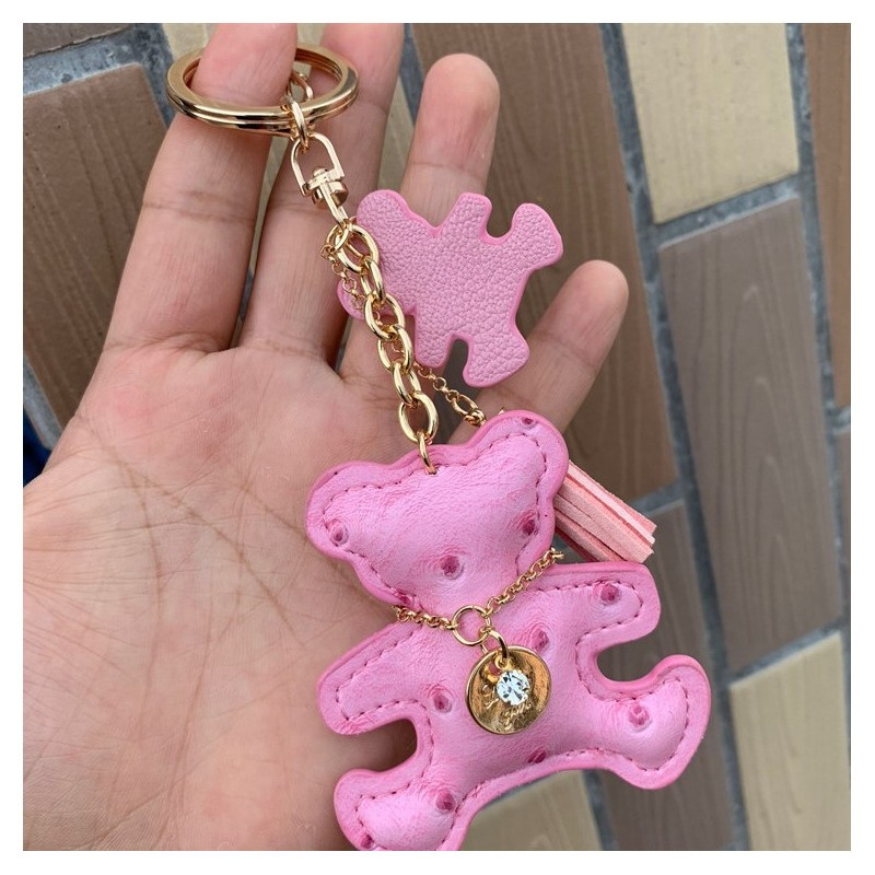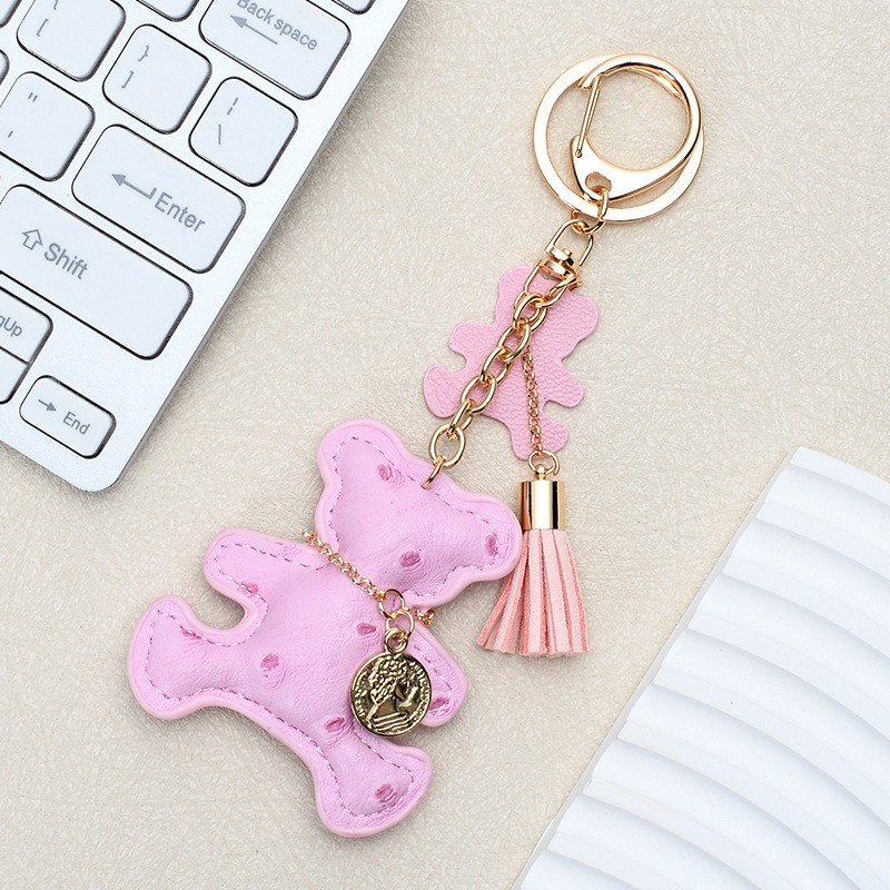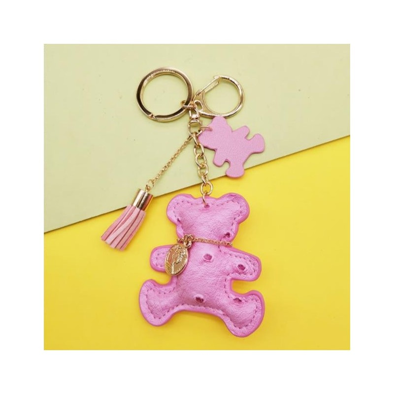 Brelok do kluczy skórzany MIŚ różowy, frędzle BRL356
