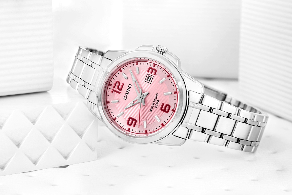Model CASIO LTP-1314D-5AVDF to zegarek stworzony z myślą o kobietach, które cenią sobie subtelny design połączony z codzienną wygodą i funkcjonalnością. Tarcza tego zegarka to prawdziwa cukierkowa przyjemność – subtelna, różowa i pełna kobiecego uroku. Jej lekki połysk i delikatny wzór dodają całości wyjątkowej słodyczy, która przyciąga spojrzenia. To idealny dodatek dla kobiet, które lubią połączenie klasyki z nutą romantycznej fantazji. Wodoodporność do 50 metrów, wyraźne oznaczenia godzin oraz praktyczny datownik czynią ten model niezawodnym towarzyszem na co dzień – niezależnie od okazji.