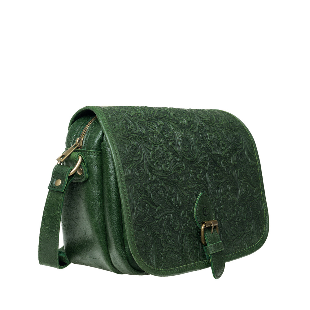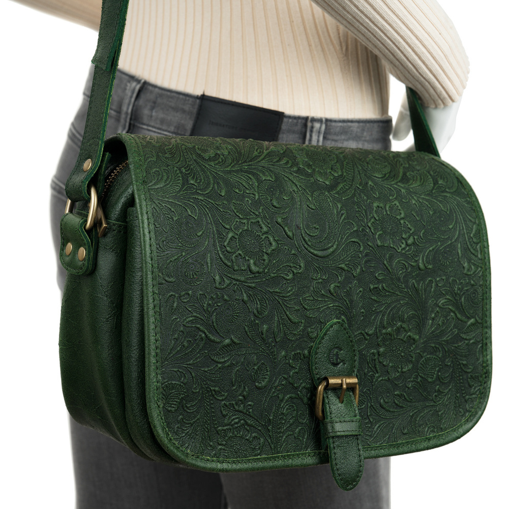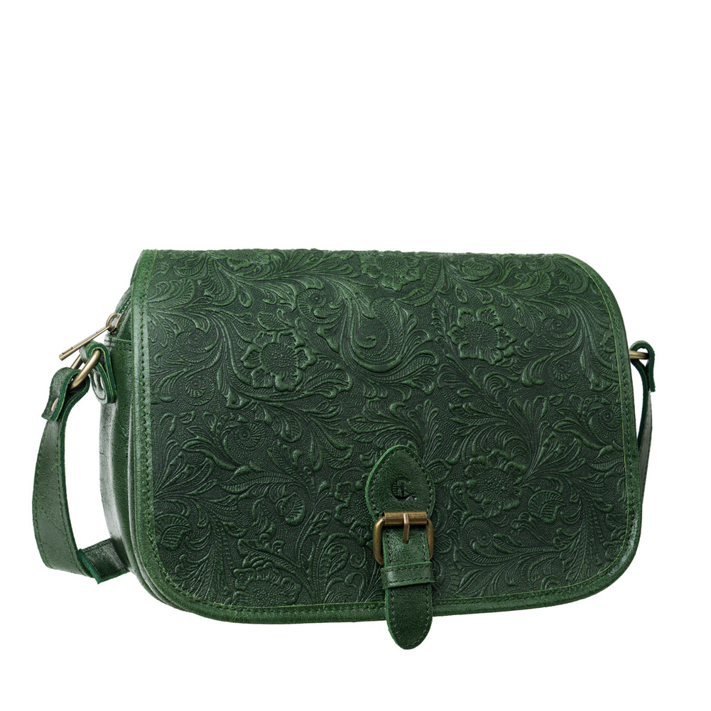 - Naturalna skóra vintage z klapką z tłoczeniem, która wyróżnia torebkę na tle innych dodatków;