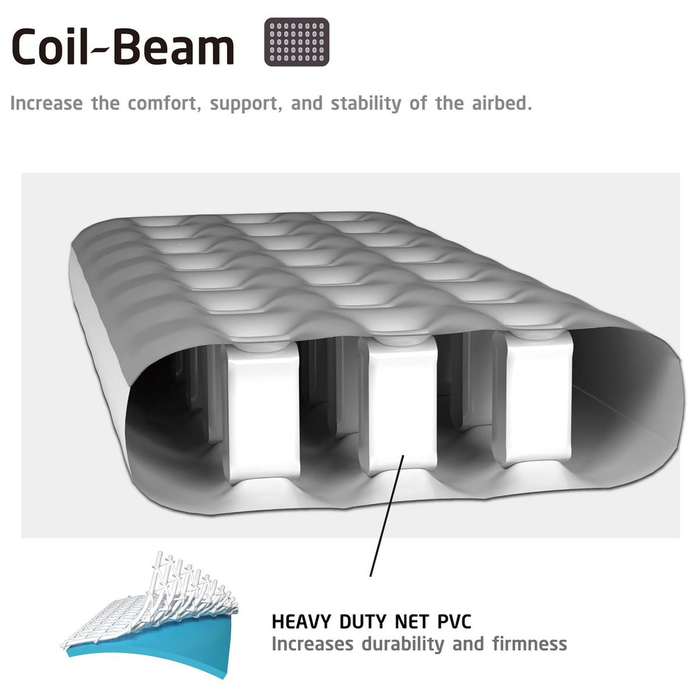 Konstrukcja Coil Beam to doskonałe rozwiązanie dla osób, które oczekują od materaca dmuchanego nie tylko wygody, ale także trwałości i stabilności.