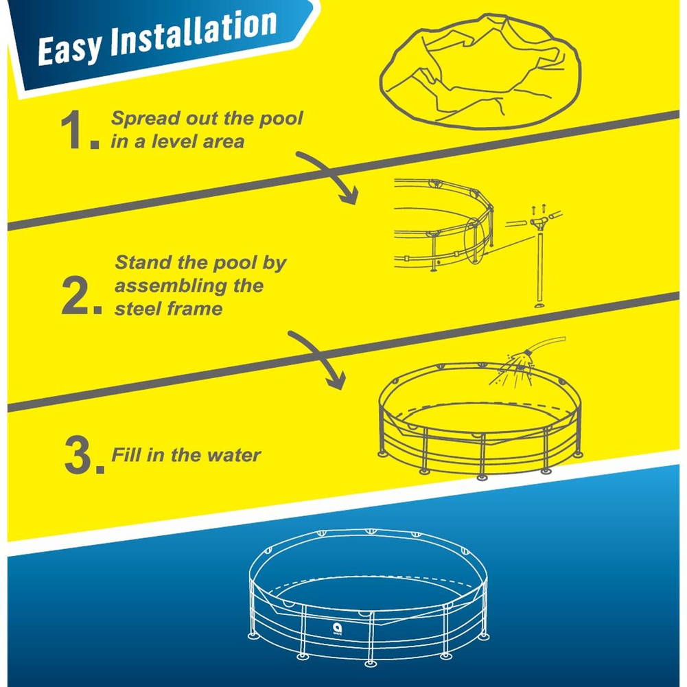 Montaż basenu jest niezwykle prosty i nie wymaga specjalistycznych narzędzi. Stalowa rama i słupki szybko łączą się w stabilną konstrukcję, która zapewnia bezpieczeństwo i wygodę użytkowania. Gotowy do napełnienia wodą w krótkim czasie!
