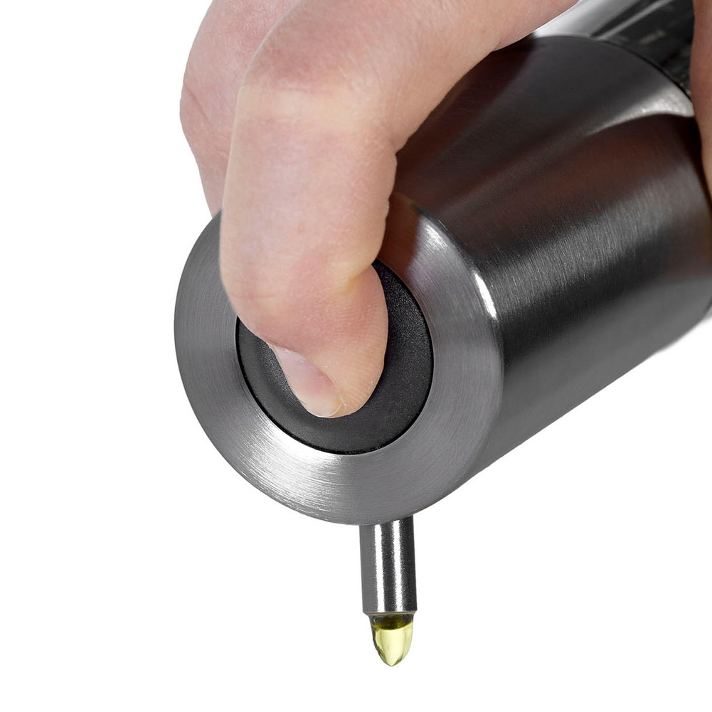 Dyspenser do oliwy lub octu AROMA wyposażony jest w system pompujący marki AdHoc. Wspomniany system umożliwia łatwe i precyzyjne dozowanie zawartości. Produkt charakteryzuje się dużym i zwracającym uwagę, przeźroczystym pojemnikiem na olej lub ocet. Dyspenser został zaprojektowany przez Gabriele Dörfler. Materiał: stal nierdzewna i akryl. Wymiary: średnica – 5,5cm, wysokość – 23,5cm, pojemność – 120ml.Bezpieczeństwo - rodzaj ostrzeżenia
