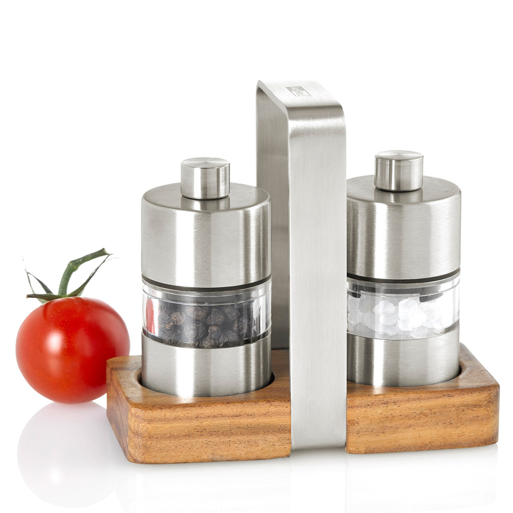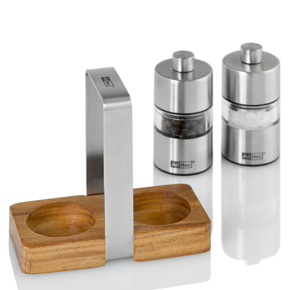Są to młynki wyposażone w bardzo wydajne żarna CeraCut®, które są wolne od zapachów i smaków, a także są niezwykle odporne na korozje i zużycie. A poza tym są to najmniejsze na świecie młynki posiadające mechanizm doboru grubości mielenia w pełnej skali od drobnego do grubego rozmiaru. Zawarta w zestawie podstawka do przechowywania zapewni czystość blatu, a także może ułatwić przenoszenie młynków. Cały zestaw jest mały i kompaktowy, co uwydatnia komfort codziennego użytkowania. Nie należy myć w zmywarce. Produkt został zaprojektowany przez AdHoc Design Team. Materiał: stal nierdzewna, akryl, drewno akacjowe. Wymiary młynka: średnica – 3,2cm, wysokość – 6,2cm. Wymiary podstawy: długość – 9,2cm, szerokość – 4,5cm, wysokość – 8,5cm.Bezpieczeństwo - rodzaj ostrzeżenia