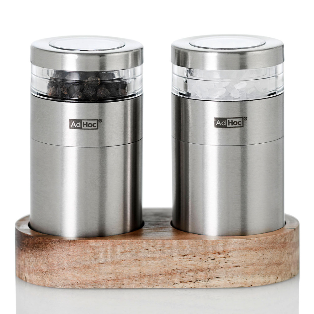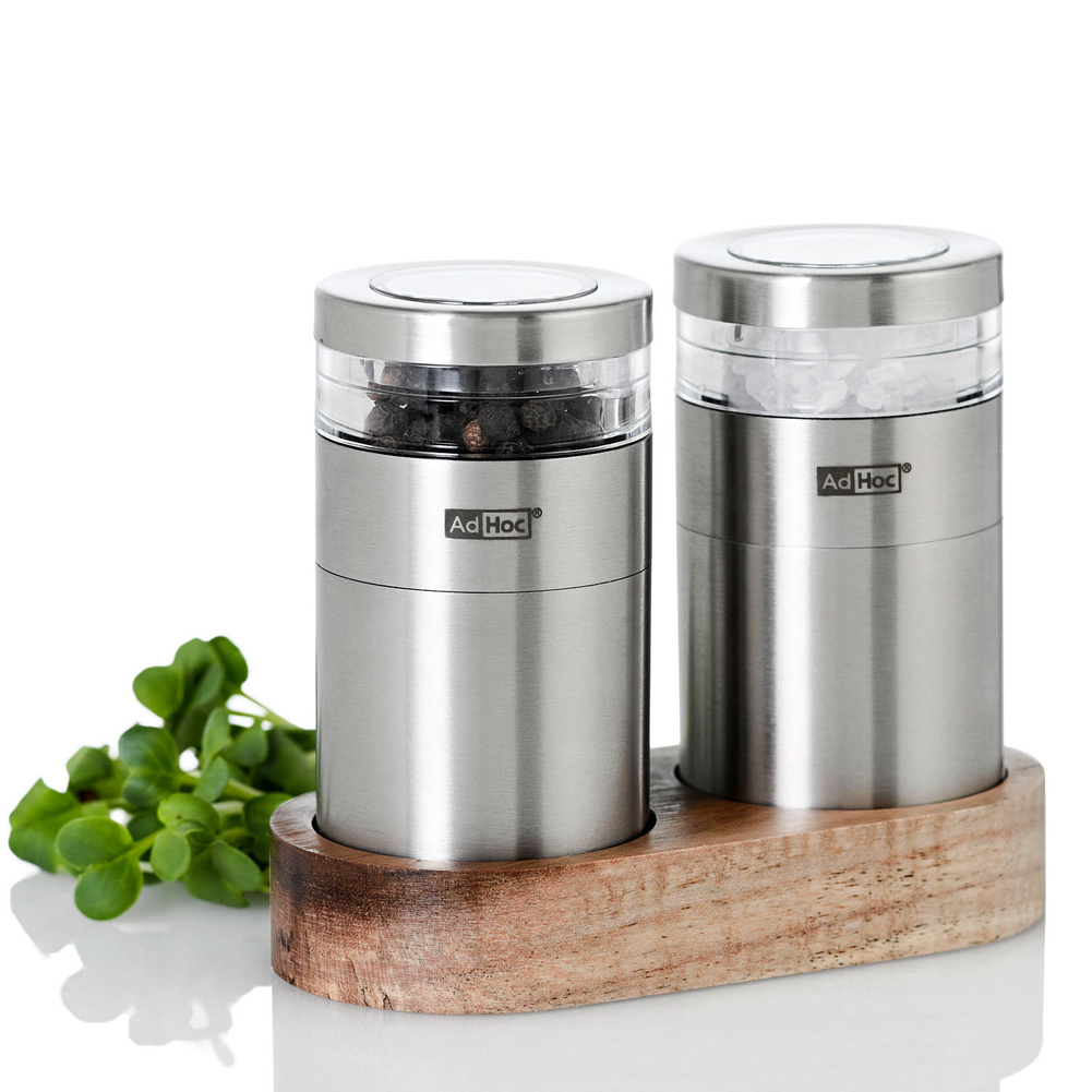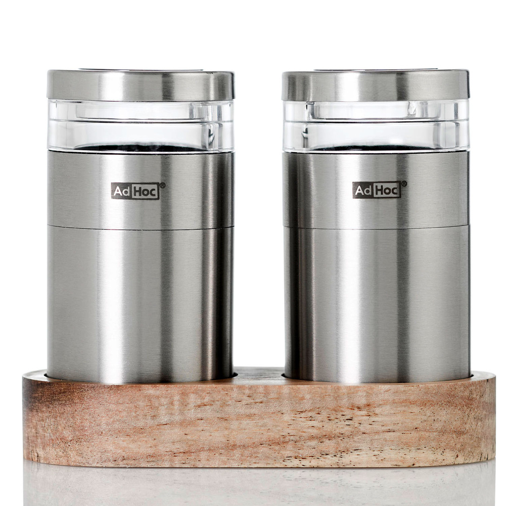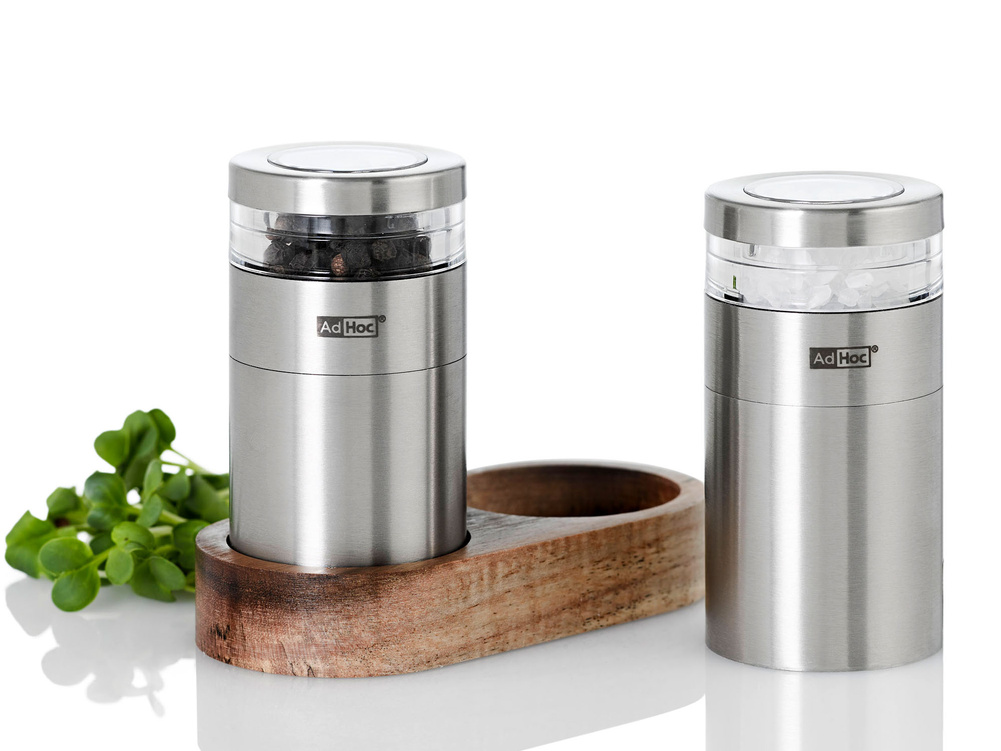 Są to młynki wyposażone w bardzo wydajne żarna CeraCut®, które są wolne od zapachów i smaków, a także są niezwykle odporne na korozje i zużycie. Młynki posiadają mechanizm doboru grubości mielenia w pełnej skali od drobnego do grubego rozmiaru. Demontowana nakrywka umożliwia łatwe napełnienie młynka, a wąskie akrylowe okienko sprawia, że przyprawy są widoczne jednocześnie nie wystawiając ich na zbyt wiele światła. Zawarta w zestawie podstawa zapewnia czystość blatu. Nie należy myć w zmywarce. Produkt został zaprojektowany przez AdHoc Design Team. Materiał: stal nierdzewna, akryl, drewno akacjowe. Wymiary młynka: średnica – 4,5cm, wysokość – 8,6cm. Wymiary podstawy: długość – 11,5cm, szerokość – 5,5cm, wysokość – 9,5cm.Bezpieczeństwo - rodzaj ostrzeżenia