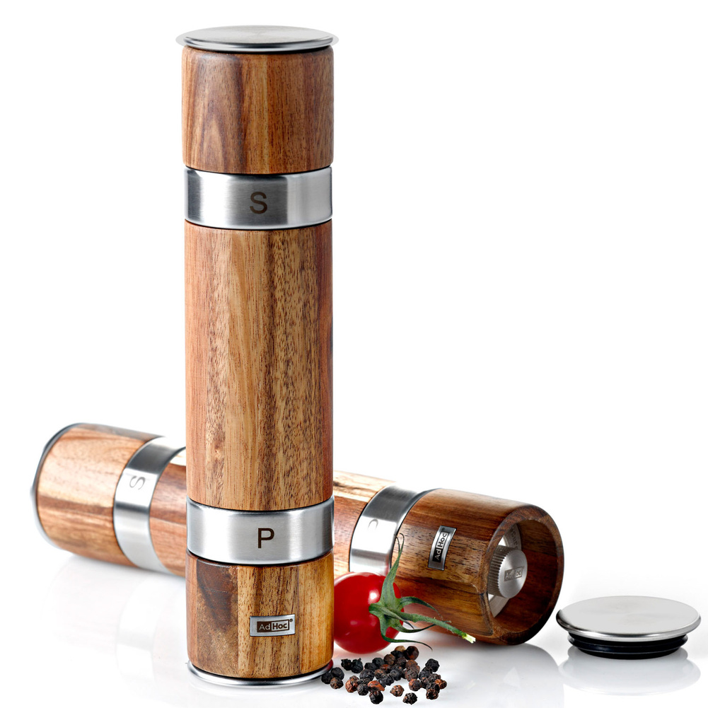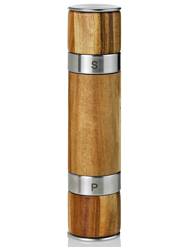 Młynek, który jednocześnie umożliwia mielenie z jednej strony pieprzu a z drugiej soli. Posiada dwa oddzielne, bardzo wydajne żarna CeraCut®, które są wolne od zapachów i smaków, a także są niezwykle odporne na zużycie i korozję. Wyposażony mechanizm zamknięcia żaren, co ułatwia utrzymanie blatu w czystości. Produkt został zaprojektowany przez Buenasoma. Materiał: drewno akacjowe, stal nierdzewna, ceramiczne żarna CeraCut®. Wymiary: średnica – 5,5cm, wysokość – 21cm.
