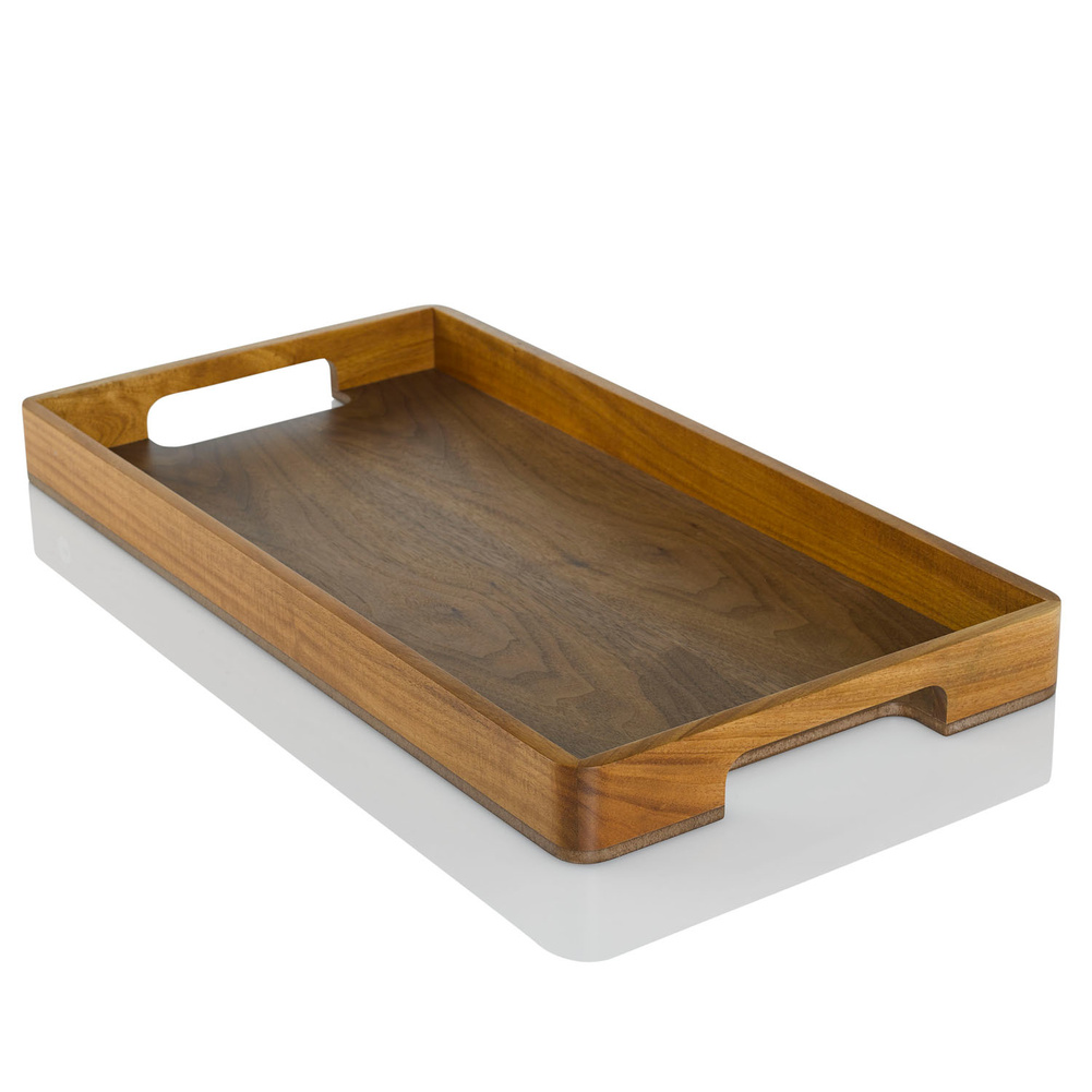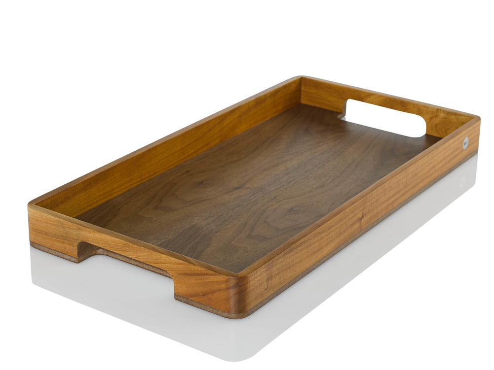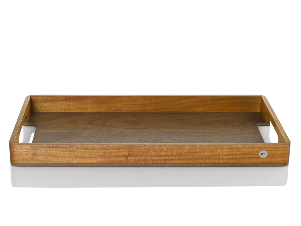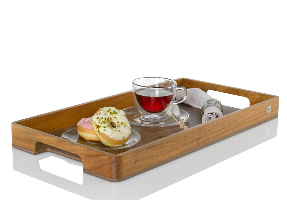 Taca umożliwia łatwe serwowanie herbaty, kawy i wielu innych rzeczy. Jest na tyle duża, że pomieści 2 talerze o średnicy 28cm. Taca posiada dwa wygodne uchwyty zapewniające pewne przenoszenie. Dodatkowy komfort dają zaokrąglone krawędzie. Produkt został zaprojektowany przez AdHoc Design Team. Materiał: drewno akacjowe, drewno orzechowe. Wymiary: długość – 60cm, szerokość – 31cm, wysokość – 5cm.
