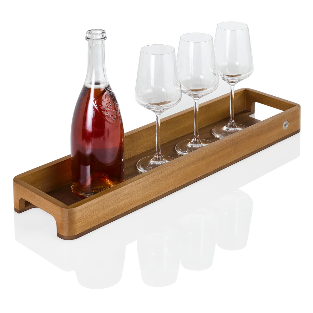 Elegancka taca z wykonana drewna akacji i orzechu. Taca pięknie prezentuje koloryt naturalnego drewna a wysokie boki skutecznie zabezpieczają transportowane naczynia. Taca z obu boków ma szerokie wycięcie umożliwiające przenoszenie. Dodatkowy komfort dają zaokrąglone krawędzie. Świetnie sprawdzi się przy serwowaniu różnego rodzaju napojów czy przekąsek. Można w niej ustawić także młynki czy dozowniki do oliwy. Produkt został zaprojektowany przez AdHoc Design Team.Bezpieczeństwo - rodzaj ostrzeżenia