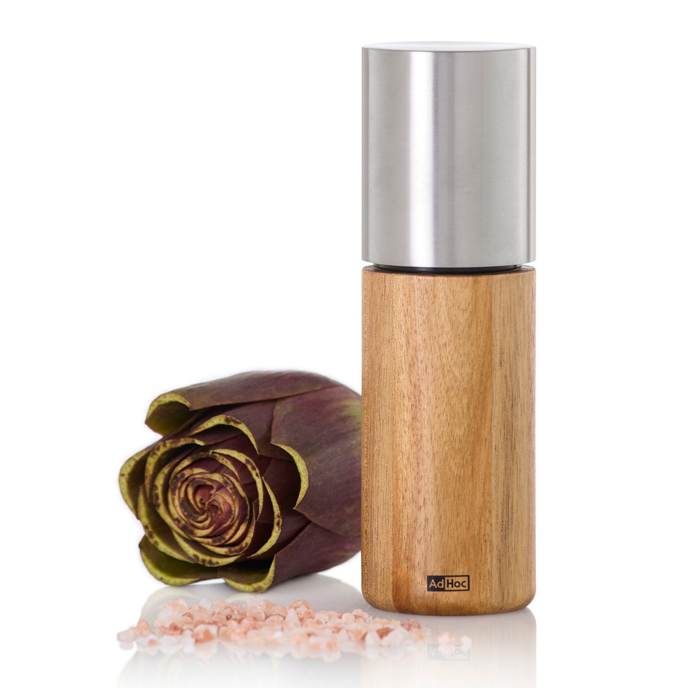 Zastosowane w urządzeniu żarna CeraCut® są wydajne, odporne na korozję i zużycie. Żarna nie chłoną zapachów, dzięki czemu zawsze możesz cieszyć się czystym, niczym niezakłóconym aromatem przypraw. Dodatkowo młynek posiada szeroki, płynny zakres regulacji grubości mielenia od drobnego proszku do grubych kawałków. Zastosowany system CAP ułatwia zdjęcie głowicy i pozwala na łatwe napełnianie młynka. Młynek jest dostępny w kilku rozmiarach. Produkt został zaprojektowany przez AdHoc Design Team. Aby napełnić młynek należy zdjąć górną część delikatnie zsuwając ją z trzpienia. Zaleca się unikać obracania żarnami podczas wykonywania tej czynności, aby nie doprowadzić do ich uszkodzenia. Po zdjęciu górnej części młynka możliwe jest napełnienie pojemnika na przyprawy. Nie zaleca się ubijania przyprawy wewnątrz pojemnika. Do swobodnego zamknięcia młynka niezbędne jest pozostawienie odpowiedniej ilości miejsca w pojemniku na przyprawy. Szczególną uwagę należy zwracać na czystość przypraw. Pewne zanieczyszczenia mogą doprowadzić do uszkodzenia żaren. Dolne pokrętło służy do regulacji grubości mielenia. W celu uzyskania bardziej rozdrobnionej przyprawy należy obracać pokrętłem zgodnie z ruchem wskazówek zegara, a gdy przyprawa powinna być zmielona grubiej należy obracać pokrętłem w przeciwnym kierunku do ruchu wskazówek zegara. Przed przystąpieniem do regulacji konieczne jest sprawdzenie czy pomiędzy żarnami nie zalega przyprawa, mogąca blokować regulację. Uwaga: Nigdy nie miel, jeżeli zbiornik na przyprawy jest pusty, może to doprowadzić do uszkodzenia żaren!