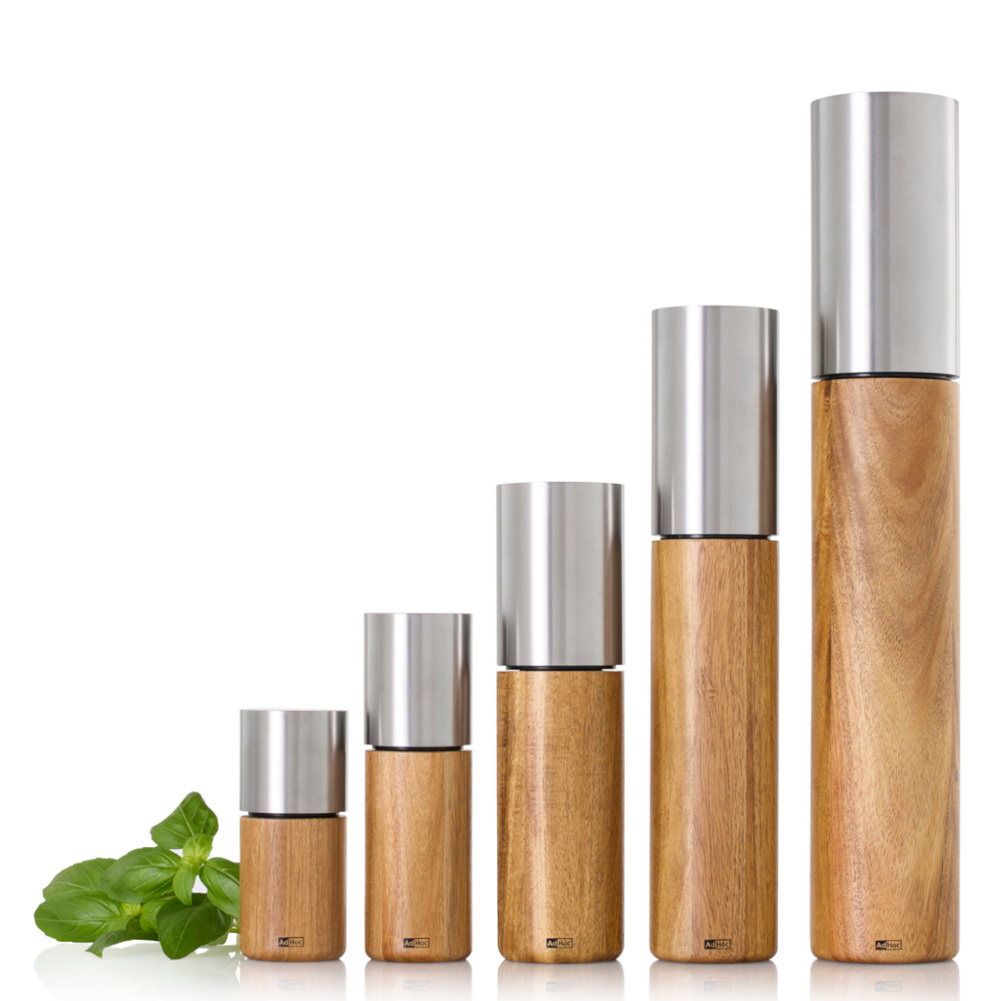 Zastosowane w urządzeniu żarna CeraCut® są wydajne, odporne na korozję i zużycie. Żarna nie chłoną zapachów, dzięki czemu zawsze możesz cieszyć się czystym, niczym niezakłóconym aromatem przypraw. Dodatkowo młynek posiada szeroki, płynny zakres regulacji grubości mielenia od drobnego proszku do grubych kawałków. Zastosowany system CAP ułatwia zdjęcie głowicy i pozwala na łatwe napełnianie młynka. Młynek jest dostępny w kilku rozmiarach. Produkt został zaprojektowany przez AdHoc Design Team. Aby napełnić młynek należy zdjąć górną część delikatnie zsuwając ją z trzpienia. Zaleca się unikać obracania żarnami podczas wykonywania tej czynności, aby nie doprowadzić do ich uszkodzenia. Po zdjęciu górnej części młynka możliwe jest napełnienie pojemnika na przyprawy. Nie zaleca się ubijania przyprawy wewnątrz pojemnika. Do swobodnego zamknięcia młynka niezbędne jest pozostawienie odpowiedniej ilości miejsca w pojemniku na przyprawy. Szczególną uwagę należy zwracać na czystość przypraw. Pewne zanieczyszczenia mogą doprowadzić do uszkodzenia żaren. Dolne pokrętło służy do regulacji grubości mielenia. W celu uzyskania bardziej rozdrobnionej przyprawy należy obracać pokrętłem zgodnie z ruchem wskazówek zegara, a gdy przyprawa powinna być zmielona grubiej należy obracać pokrętłem w przeciwnym kierunku do ruchu wskazówek zegara. Przed przystąpieniem do regulacji konieczne jest sprawdzenie czy pomiędzy żarnami nie zalega przyprawa, mogąca blokować regulację. Uwaga: Nigdy nie miel, jeżeli zbiornik na przyprawy jest pusty, może to doprowadzić do uszkodzenia żaren!